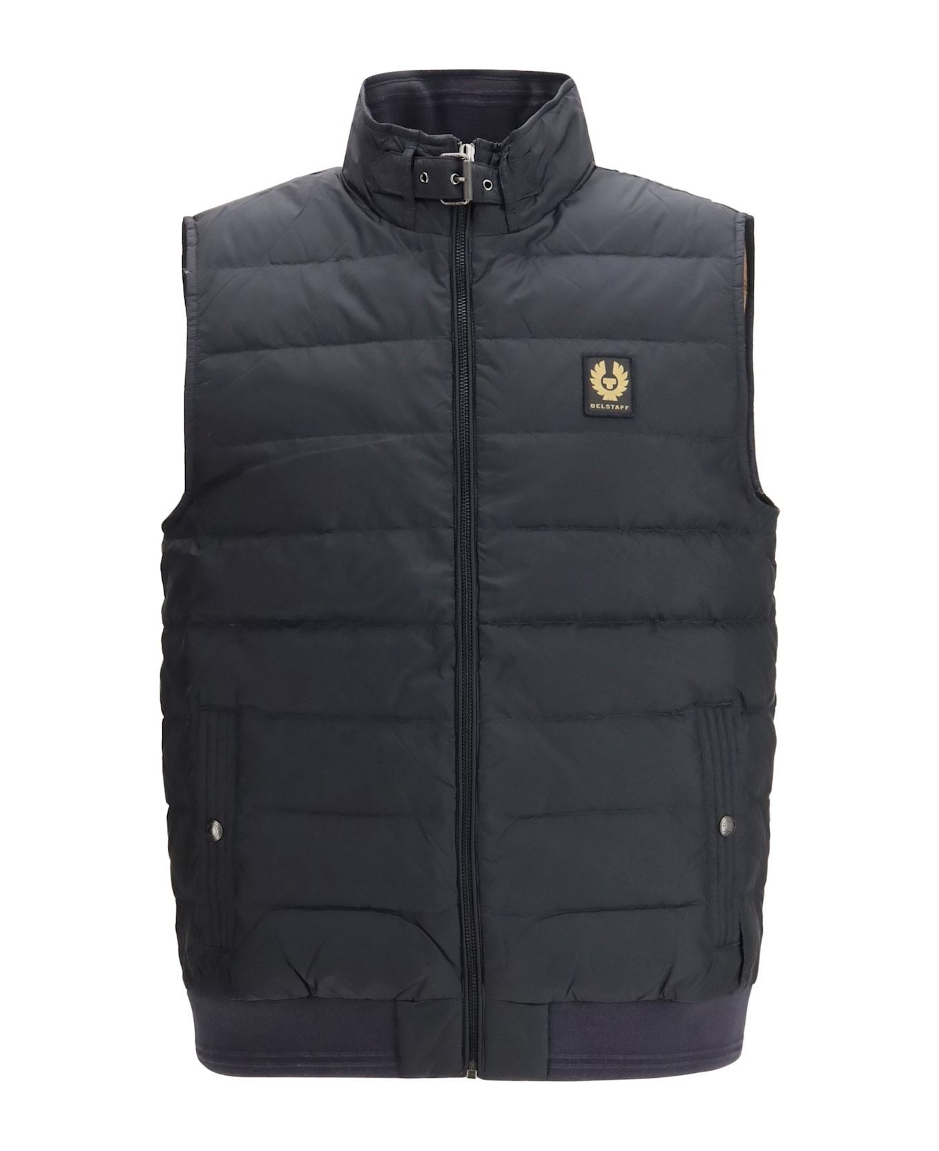 The circuit padded nylon gilet by belstaff delivers a technical and purposeful design with a distinctive attitude. crafted from high-density water-repellent nylon and padded with down, it features channel quilting that enhances its lightweight and packable construction. the exposed central zip closure and adjustable collar with serrated buckle define a functional, contemporary look, finished with side pockets detailed with multiple stitching and snap buttons, reflecting belstaff s utilitarian aesthetic.