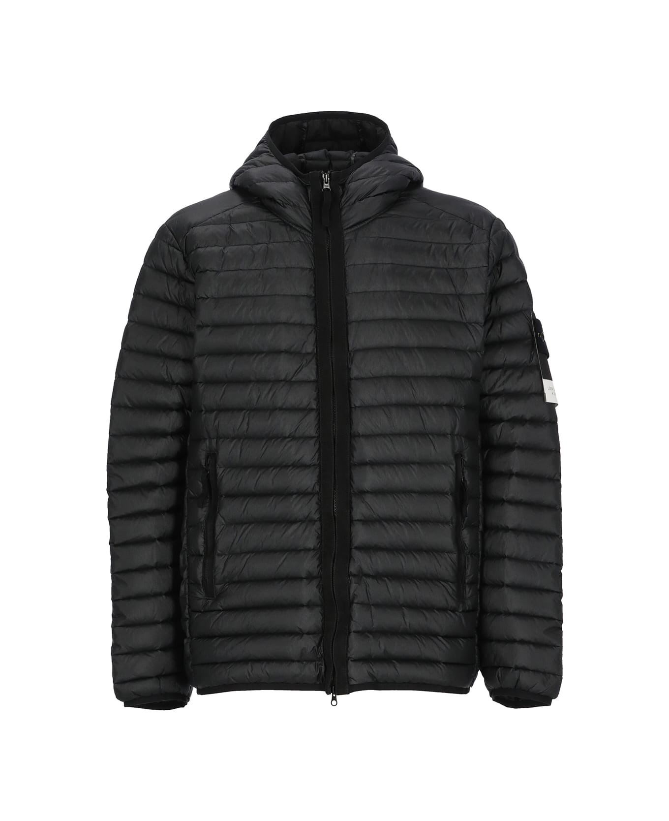 - Black Stone Island padded short jacket for man - High neck - Long sleeves - Hood - Loged badge at left sleeve - Front zip fastening - Two front zip pockets - Two internal pockets Composition: 100% Polyamide