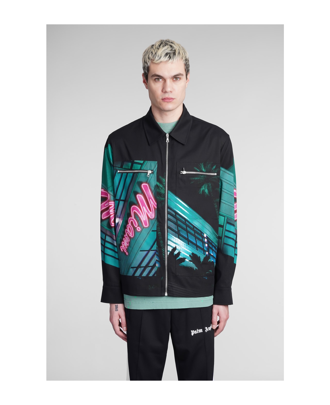 Casual jacket in black cotton, collar, two front zip closure, zip clousure, long sleeves, all over print, 100% cotton, Made in Italy, Model is 183 cm and wears 48