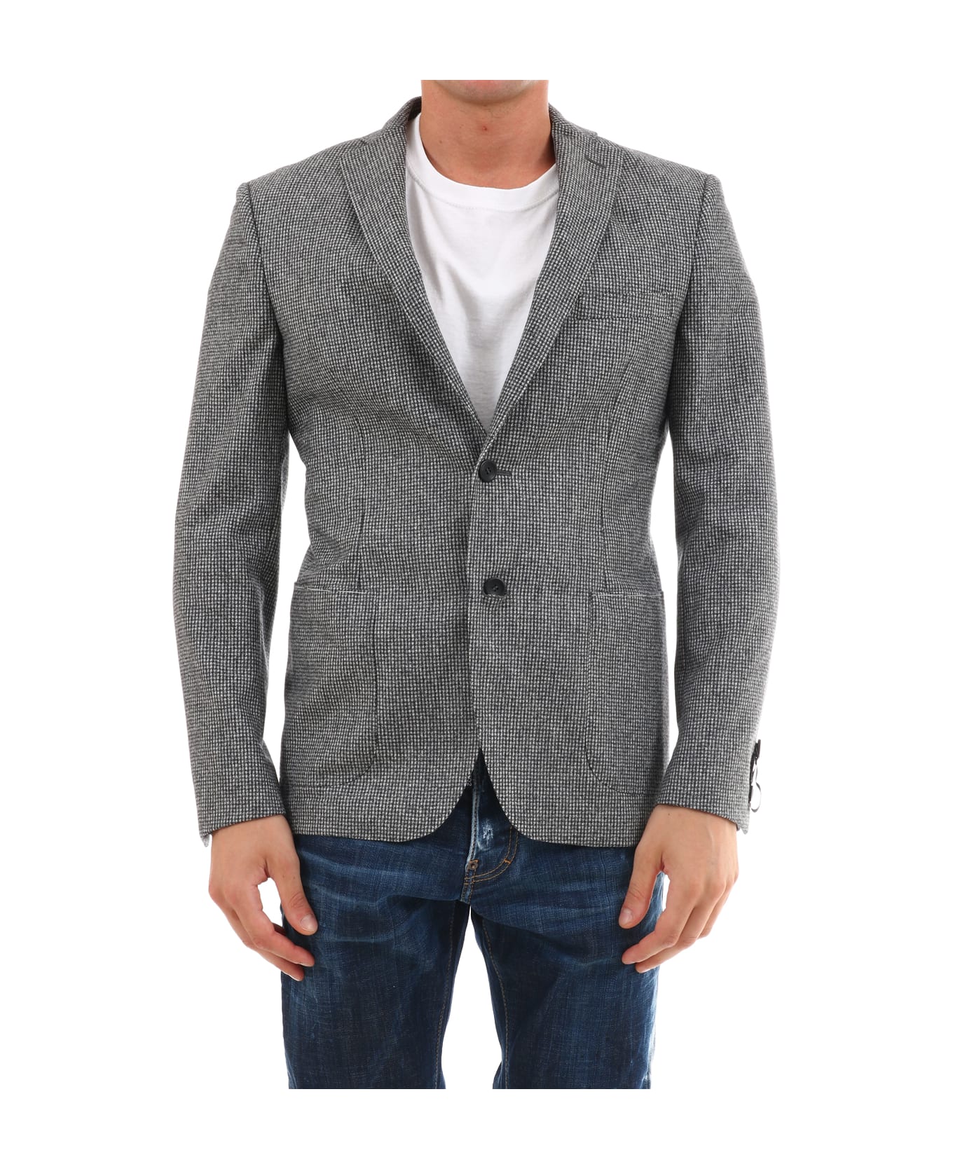 Single-breasted gray wool jacket with two-button closure. Two side pockets and a chest pocket.