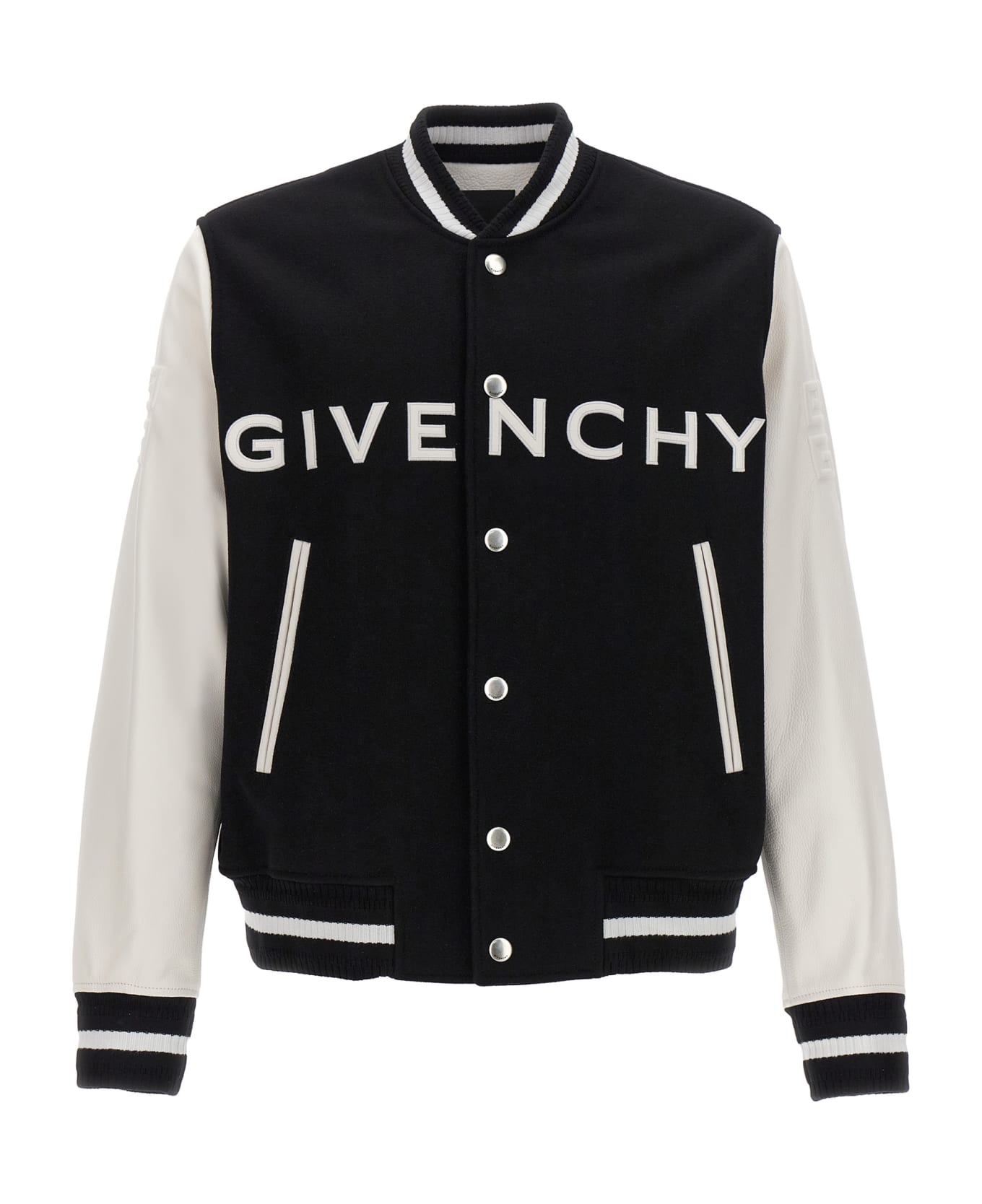 Wool and leather bomber jacket with snap button closure, contrast leather details and logo. Composition: 80% wool 20% polyamide