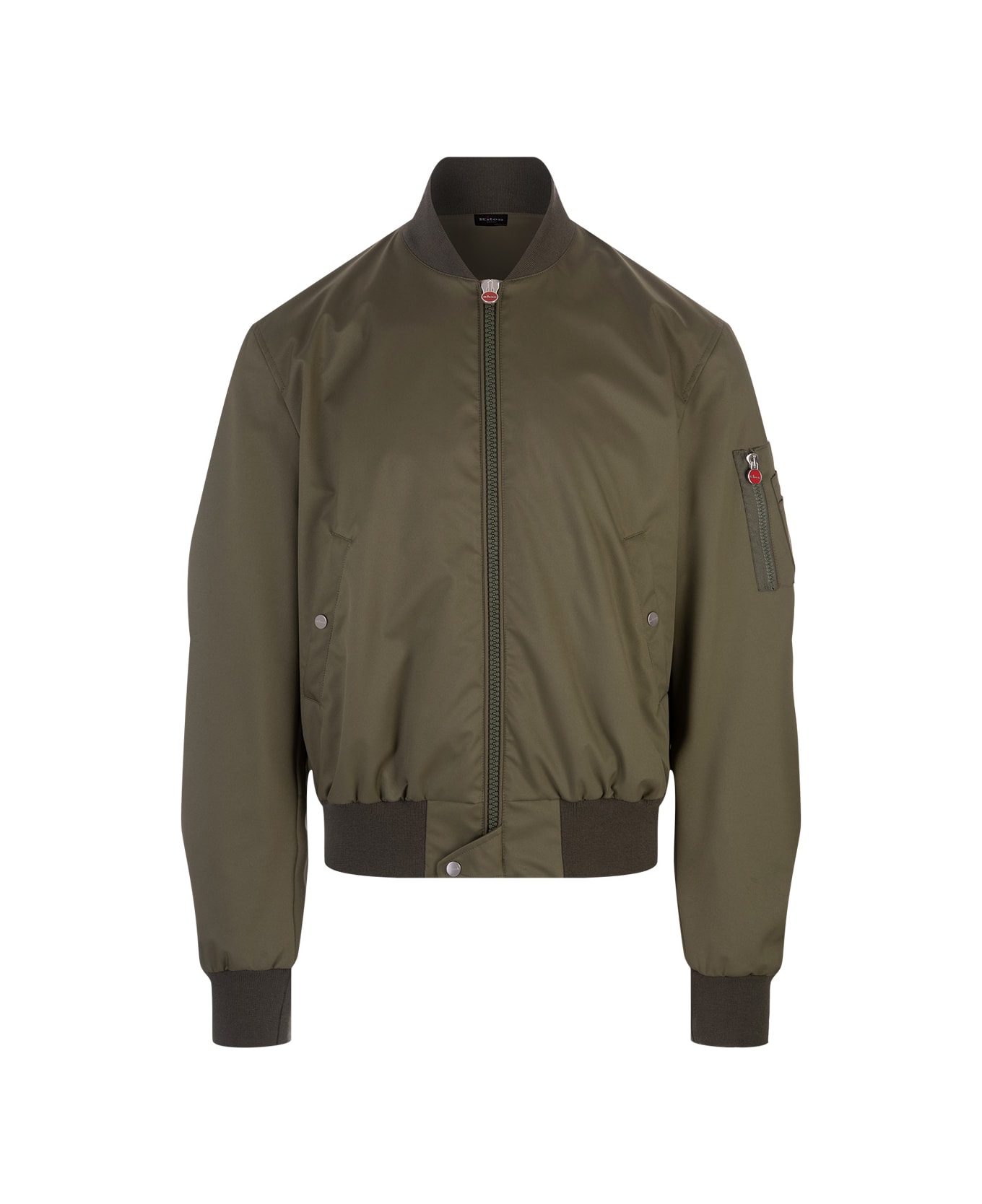 Men's Kiton bomber jacket made of olive green nylon with ribbed stretch knit profiles. Regular fit model characterised by long sleeves, small pocket on the sleeve, two side pockets with snap button, front fastening with two-way zip and single snap button on the bottom.
