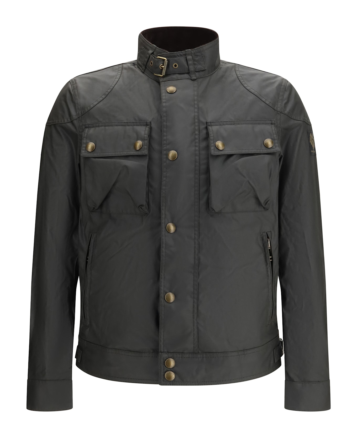 The racemaster jacket by belstaff is a classic with military character, made of water-repellent and windproof fabric. it features four exterior pockets, reinforcement patches and corduroy details on the collar, cuffs and hem for added comfort and durability. it features a zippered front closure with snap button flap, collar with adjustable buckle, two flap pockets with snap buttons, two lower zippered pockets and one inside pocket. antique brass trim and iconic belstaff patches, including the phoenix on the left sleeve, complete the design.