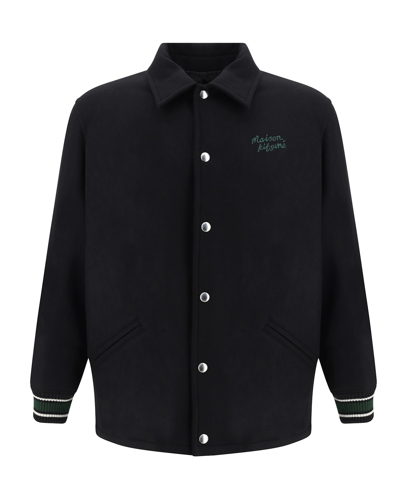 Wool varsity jacket by maison kitsuné, classic collar, front snap button closure, ribbed cuffs, two side welt pockets, contrasting embroidered iconic brand monogram on front, all-over quilted design, monochrome pattern, regular fit.
