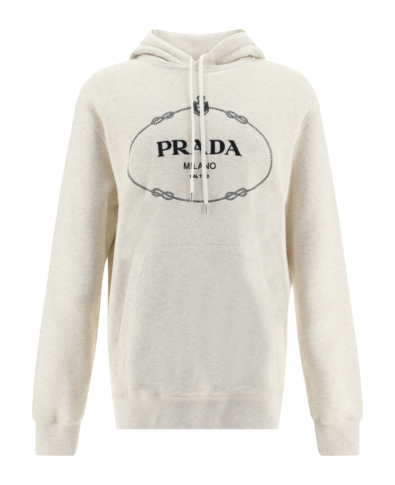 Cotton hoodie by prada, hood with adjustable drawstring, ribbed cuffs, ribbed hem, front kangaroo pocket, contrasting embroidered iconic brand monogram on front, monochrome design, regular fit. Composition: 100% % Cotton