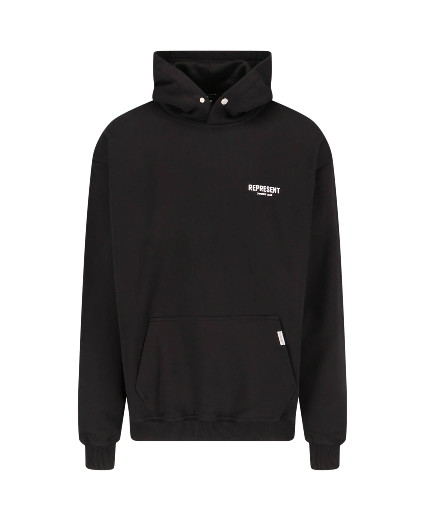 Represent 'Owners Club Hoodie'' sweatshirt in black cotton with hood, button closure, dropped shoulders, contrasting chest logo, maxi front pocket, contrast front label, elastic cuffs, contrasting maxi logo print on the back, ribbed trim, straight hem.