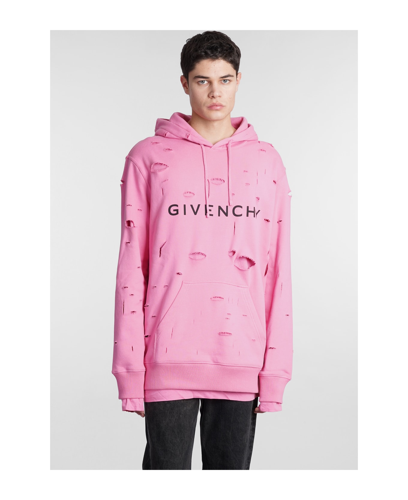 Sweatshirt in rose-pink cotton, adjustable hood with laces, destroyed detail, long sleeves, ribbed cuffs and bottom, logo print on front, 100% cotton, Model is 1. 83 and wears size M
