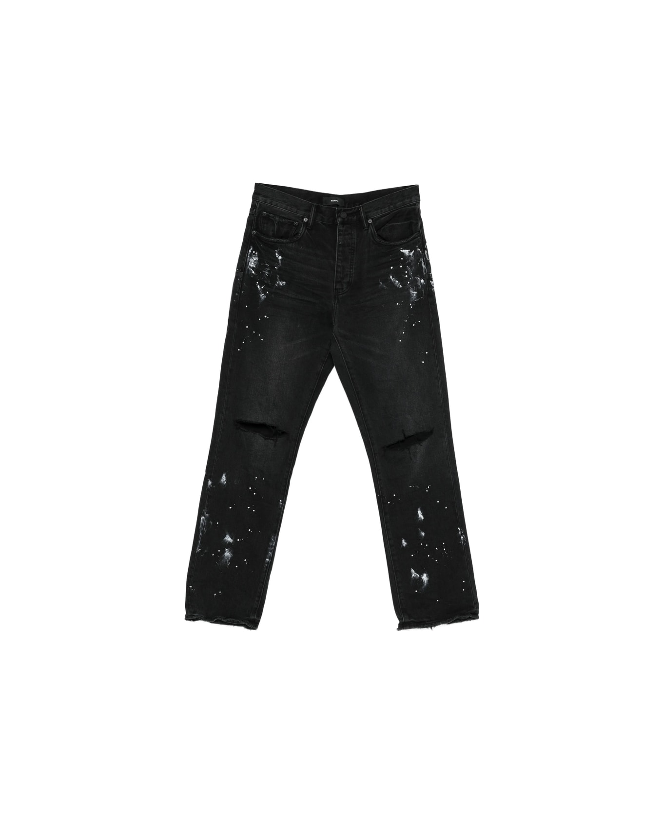 black ripped detailing paint splatter effect button fastening five pockets frayed hem