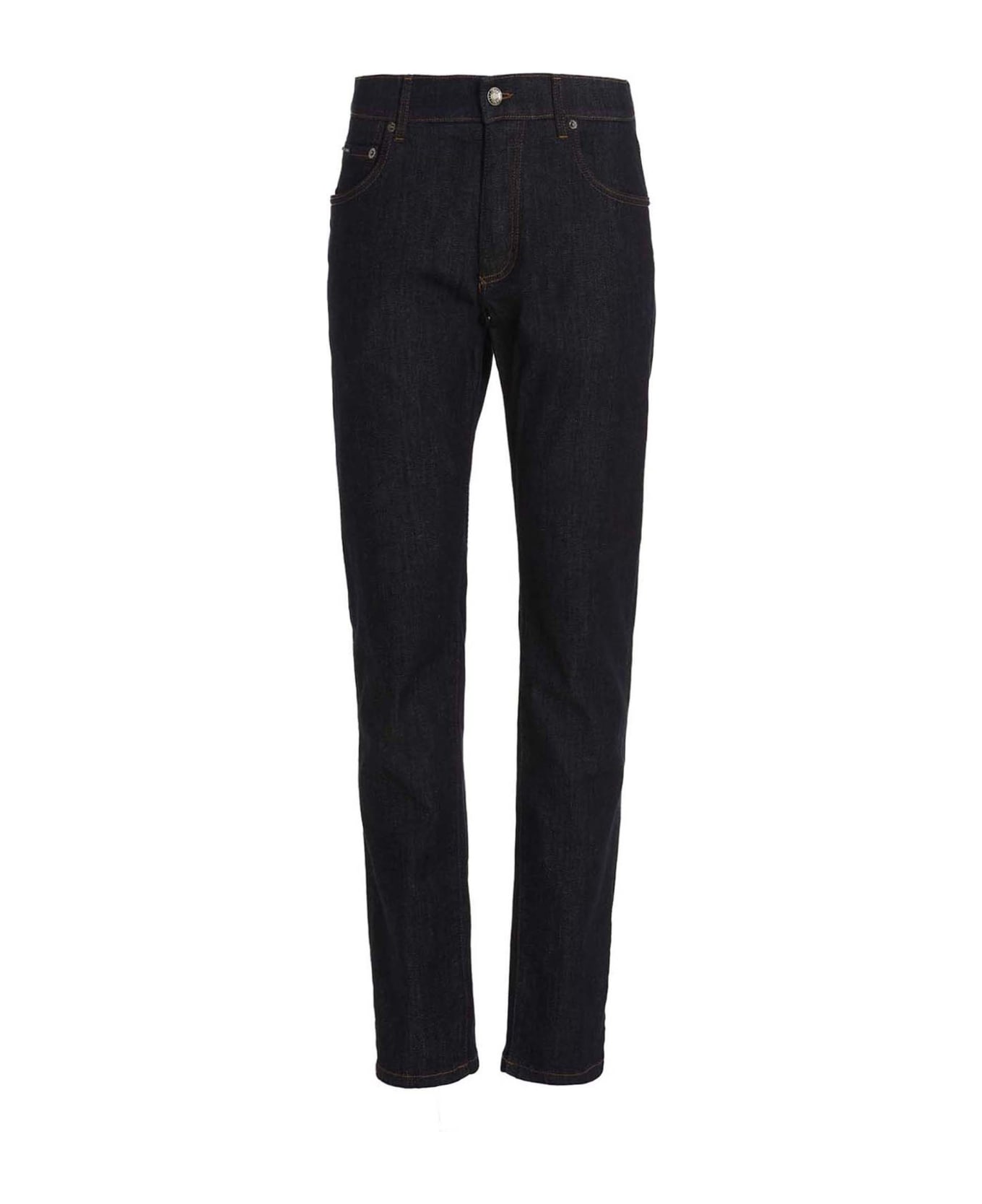 Stretch cotton denim jeans with zip and button closure, five pockets, back logo plaque, and a skinny leg.