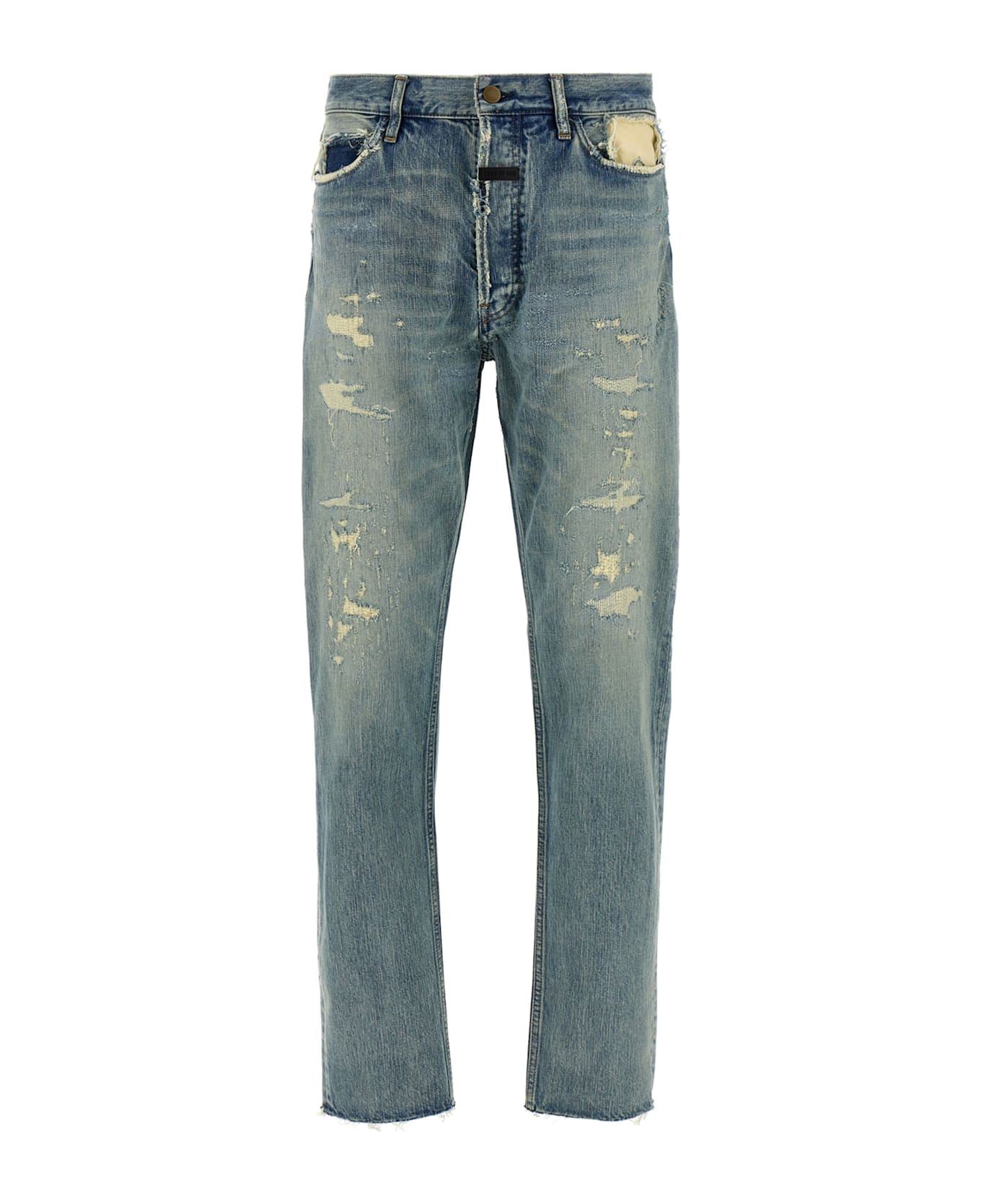 'Repaired Classic 5 Pocket' vintage effect medium indigo denim jeans, straight leg, raw cut hem, button closure with front leather logo patch, five pockets. Composition: 100% cotton