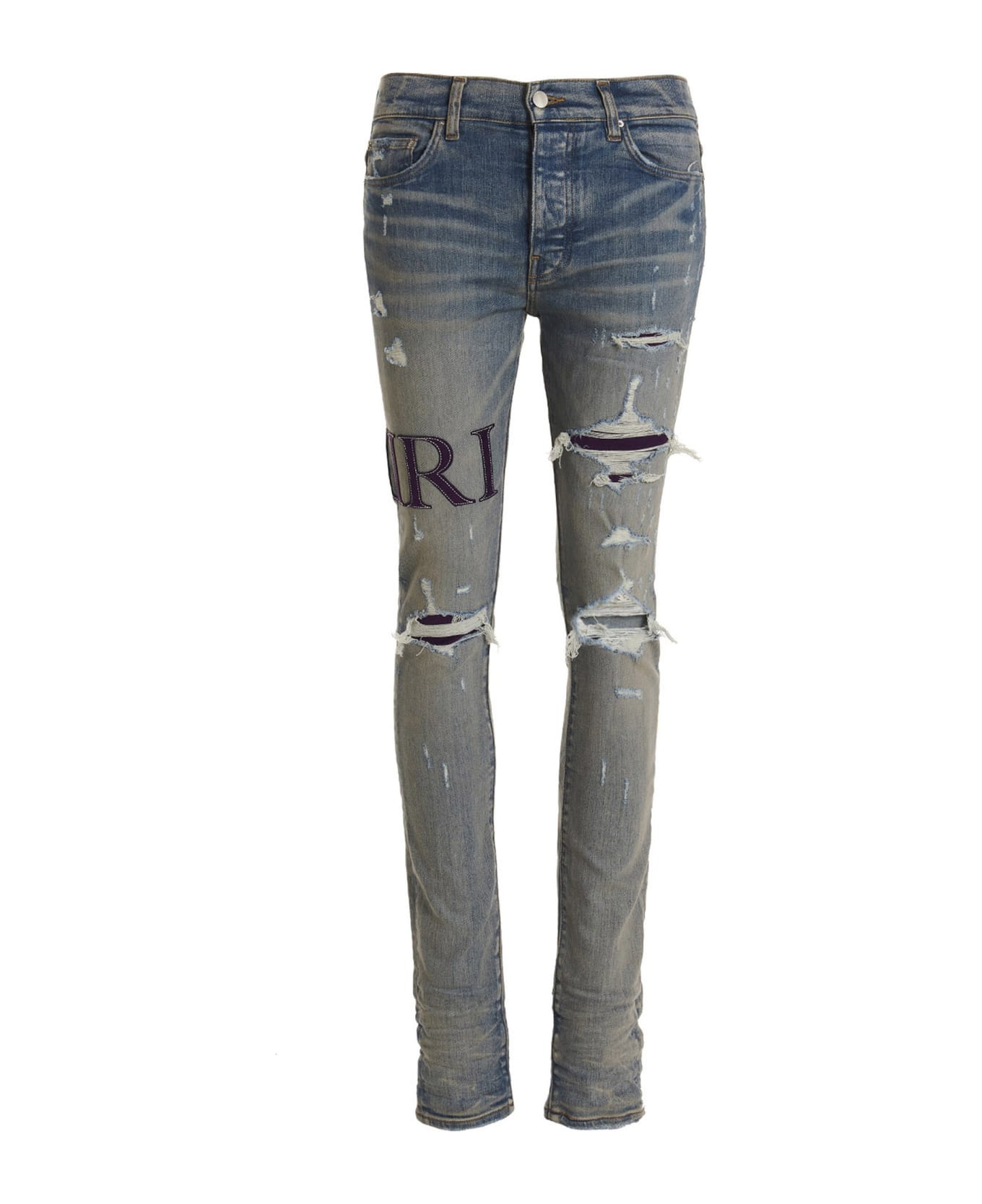 'Serif Logo stretch cotton denim jeans with all over used and destroyed effect details with contrasting patches, a contrasting logo appliqué, a button closure, five pockets, leather logo tag.