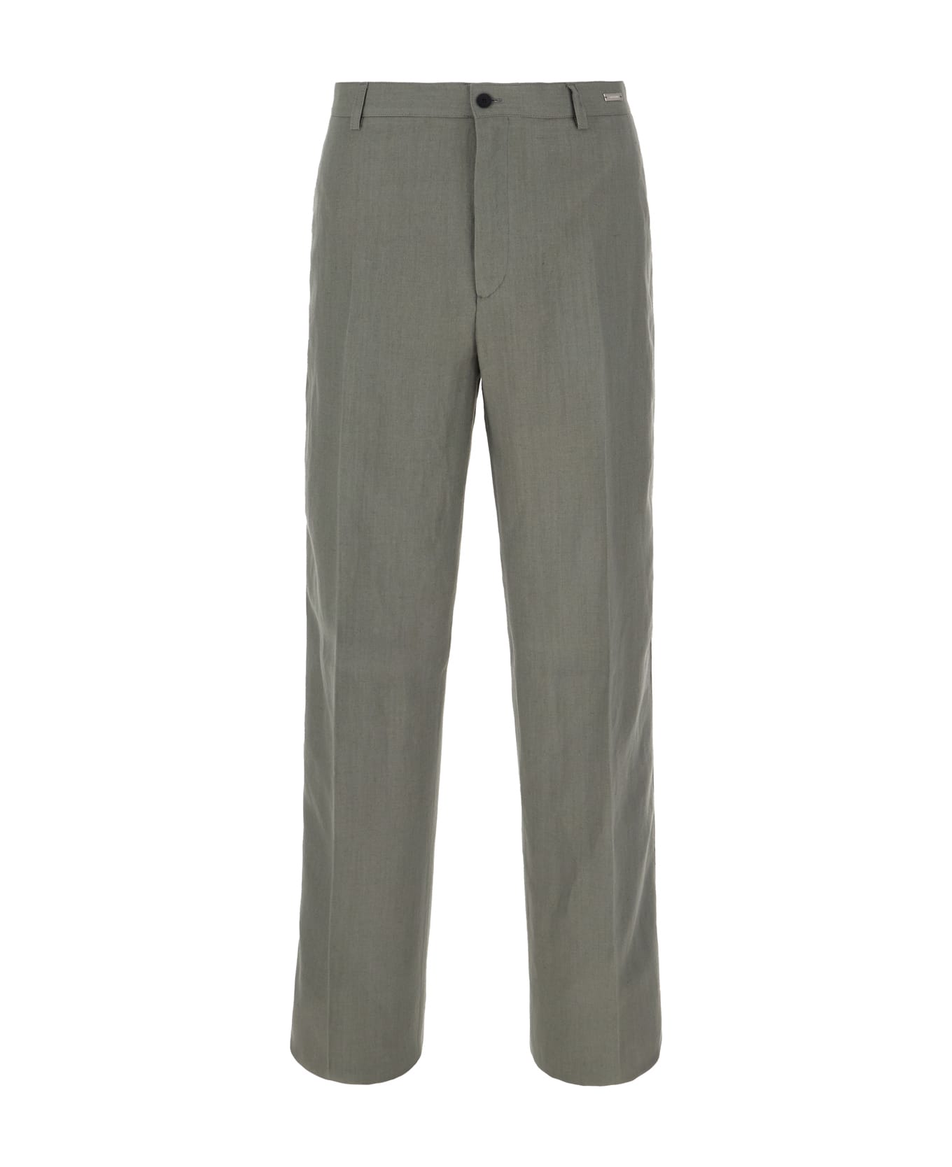 Pants realized in viscose blend enriched by metal logoed plate at the front. -Belt loops at the waist -Concealed zip with a single visible button closure -Seam pockets and two slit pockets at the back -Central ironed pleat Composition: Exterior: 54% Viscose 46% Linen