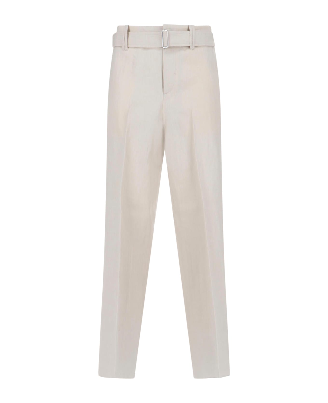Lardini tailored pants in cream linen and cotton blend, high waist, zip and hook closure, tone-on-tone adjustable buckle belt, two side pockets, two back button welt pockets, straight leg.