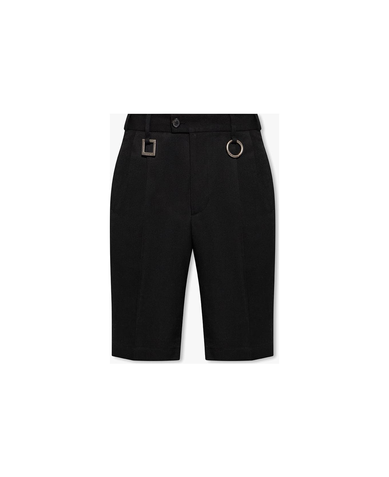 Black 'carre' Shorts from Jacquemus Black 'Carre' pleat-front shorts from Jacquemus. Made of cotton, this pair features a zip and button closure, four pockets, straight legs and decorative keyrings.