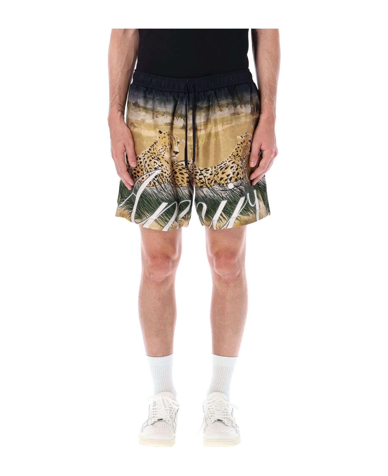 Cheetah Print Shorts By Amiri. Featuring: Silk Shorts Regular Waist Elasticated Drawstring Waistband Multi-coloured Leopard Print Model Is 1,90 M Tall And He Is Wearing Size L