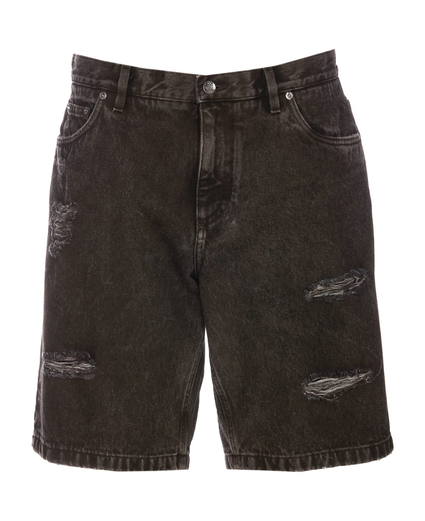 Dolce&Gabbana black denim shorts, frotntal button and zip closure, 5 pockets, distressed, plaque logo on the back Composition: 100% Cotton