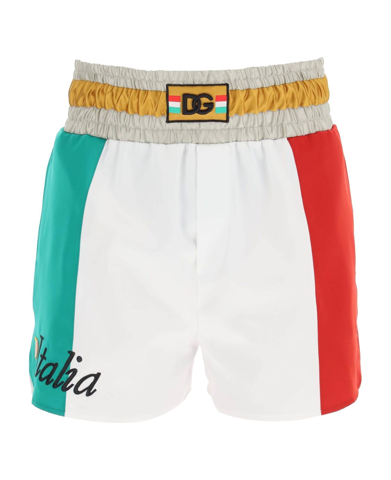 Sporty shorts in technical satin by Dolce & Gabbana, featuring a tricolor panel construction reproducing the Italian flag. Contrast elasticated waistband with embroidered DG logo patch, embroidered "Italia" lettering at the hem with small badge appliqué. Side pockets, mesh lining. The model is 187 cm tall and wears a size IT 48.