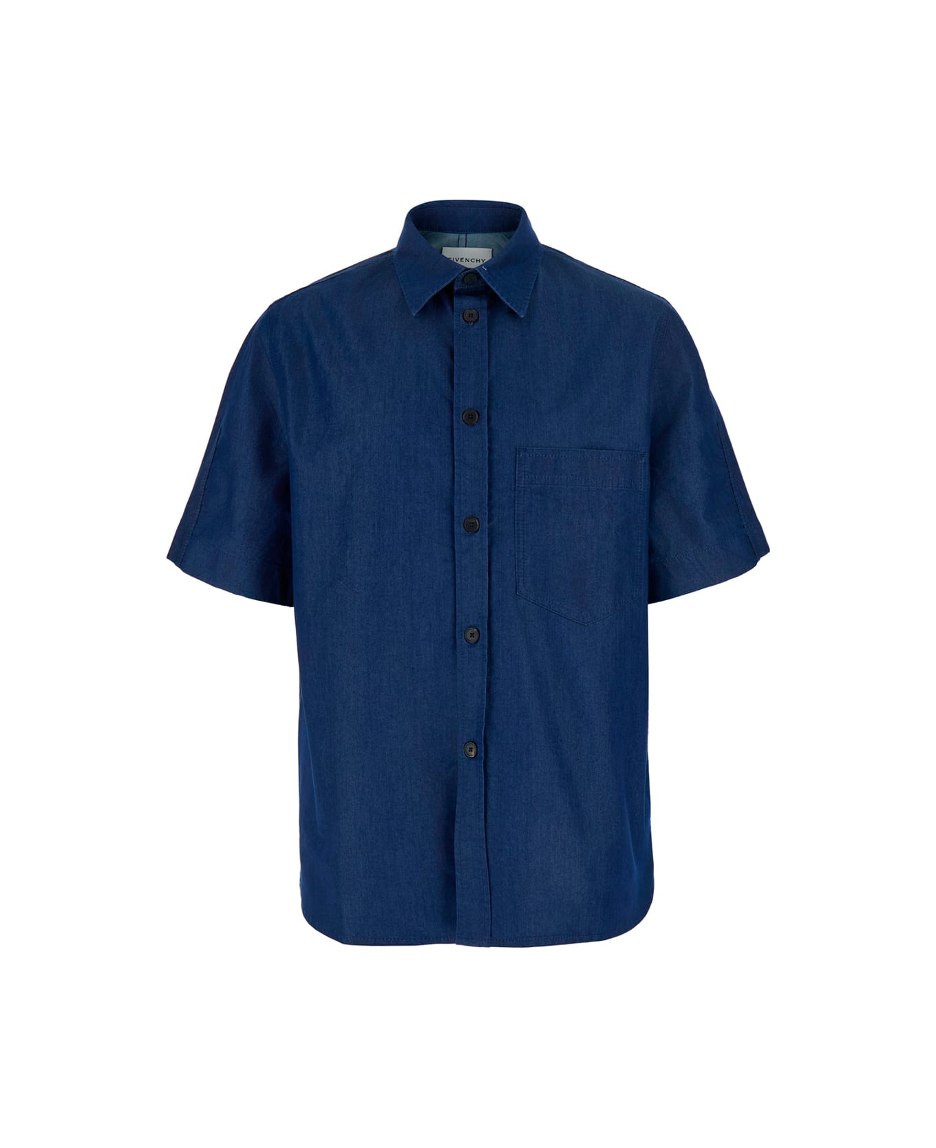 Blue shirt with collar and long sleeves. It features a front button closure and a simple design. The hem is straight. In Cotton Blend and Tech Fabric. Regular fit. Composition: 52% Cotton 48% Polyamide