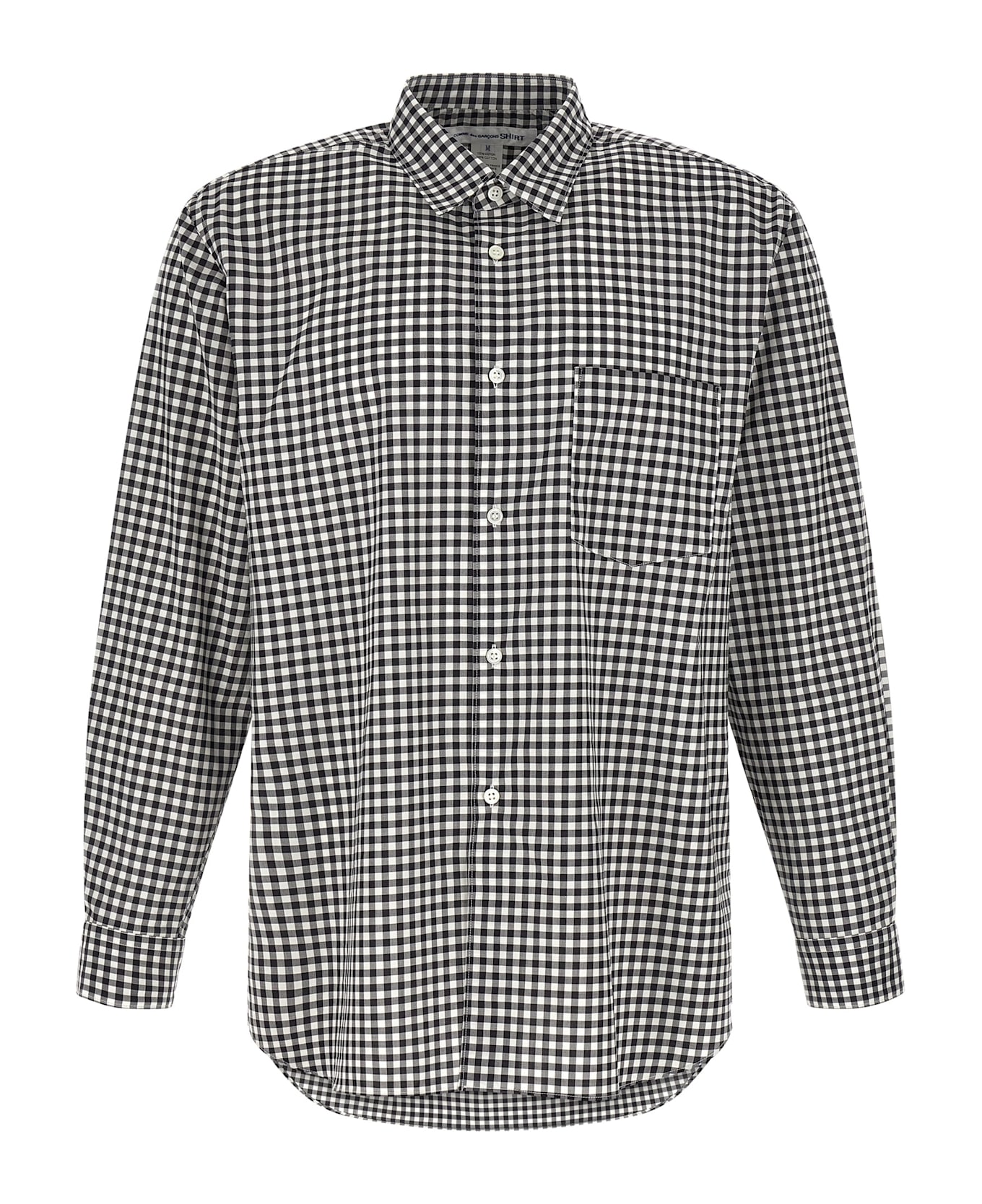 Vichy print cotton poplin shirt, chest pocket, front mother-of-pearl button closure, long sleeves with cuffs and slightly dropped shoulders, rounded hem.