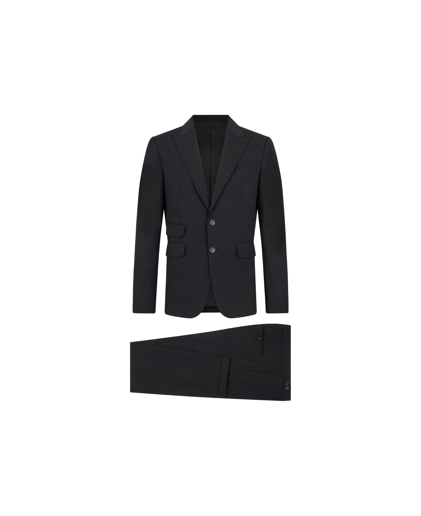 black peak lapels button fastening flap pockets buttoned cuffs belt loops