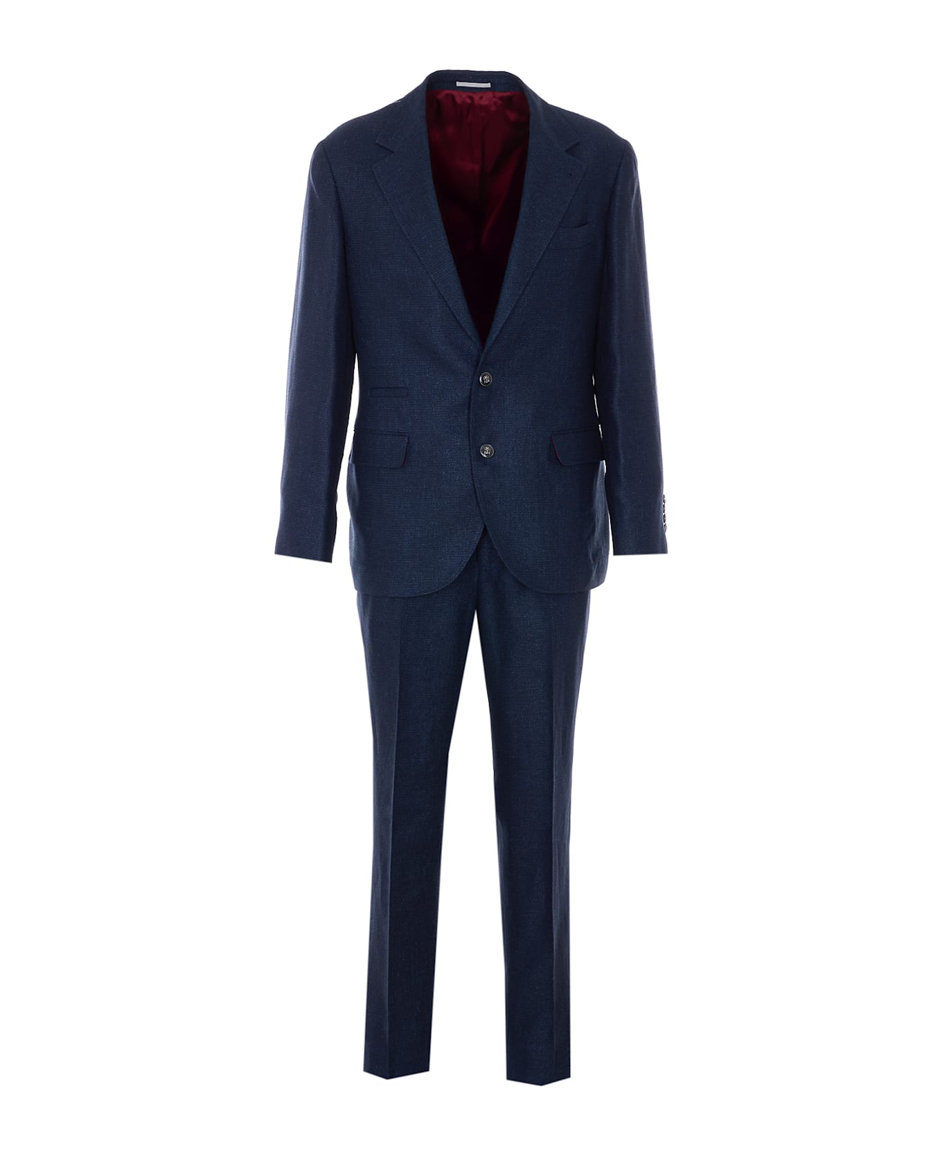 Brunello cucinelli blue suit, jacket with single breasted buttons closure, long sleeves, buttons on cuffs, pants with hook, button and zip closure, lateral pockets, regular fit Composition: 49% Silk, 31% Linen, 20% Wool, 100% Cotton