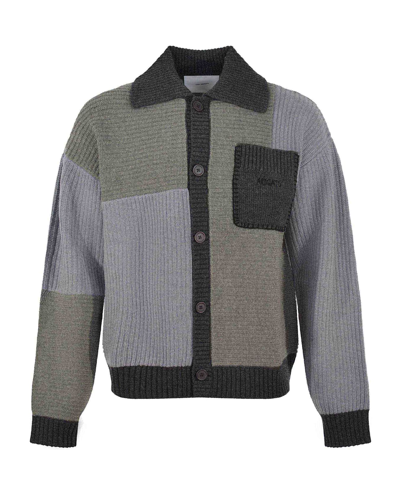 Axel Arigato cardigan in patchwork wool blend. Light grey/Dark grey. Button closure. Patch pocket on the front. Brush logo on the pocket. 80% wool 20% recycled nylon Composition: Misto Lana