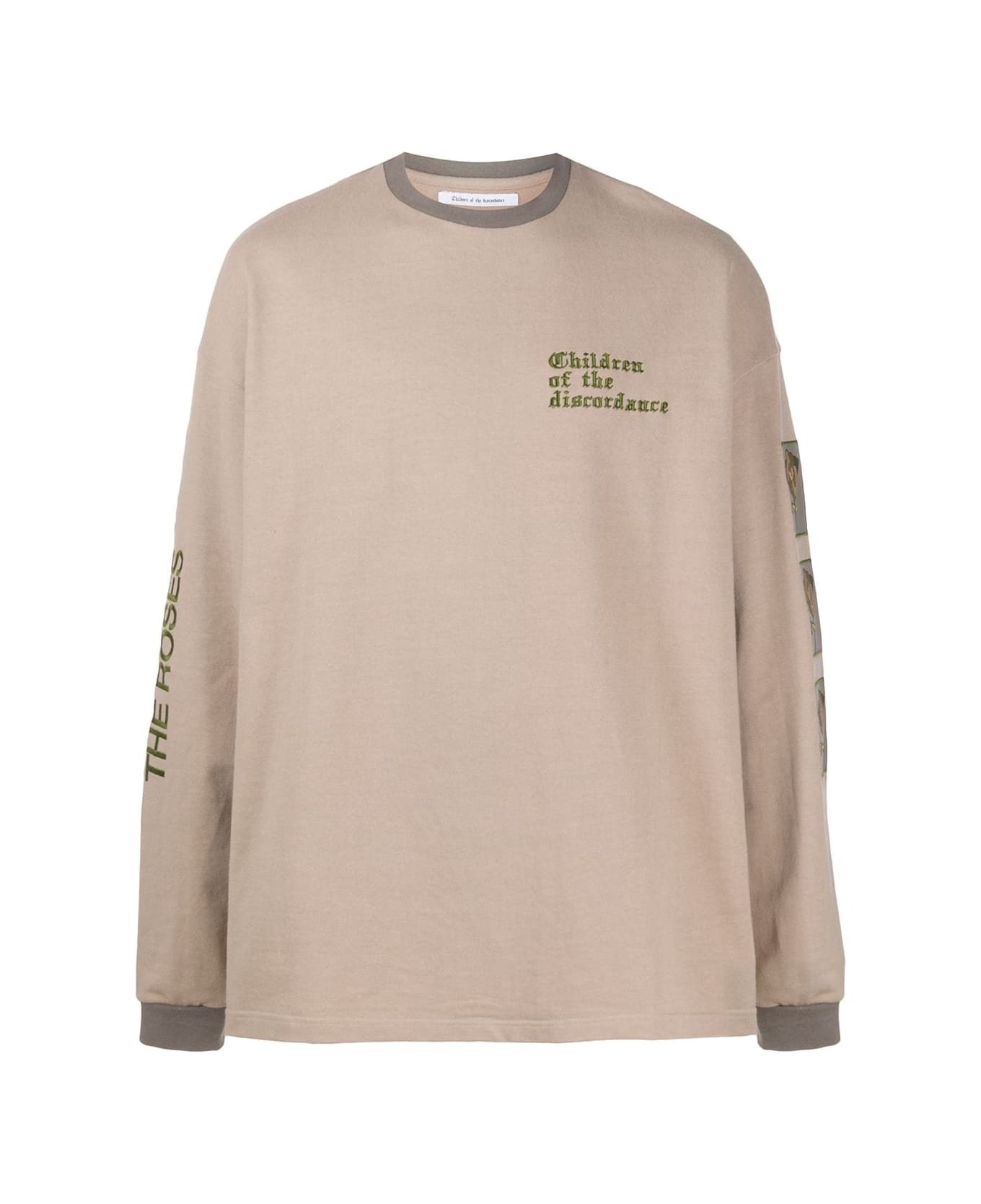 Khaki beige cotton embroidered logo sweater from Children of the Discordance featuring a contrasting collar, a logo to the chest, embroidered details, a slogan detail, long sleeves and a straight hem.