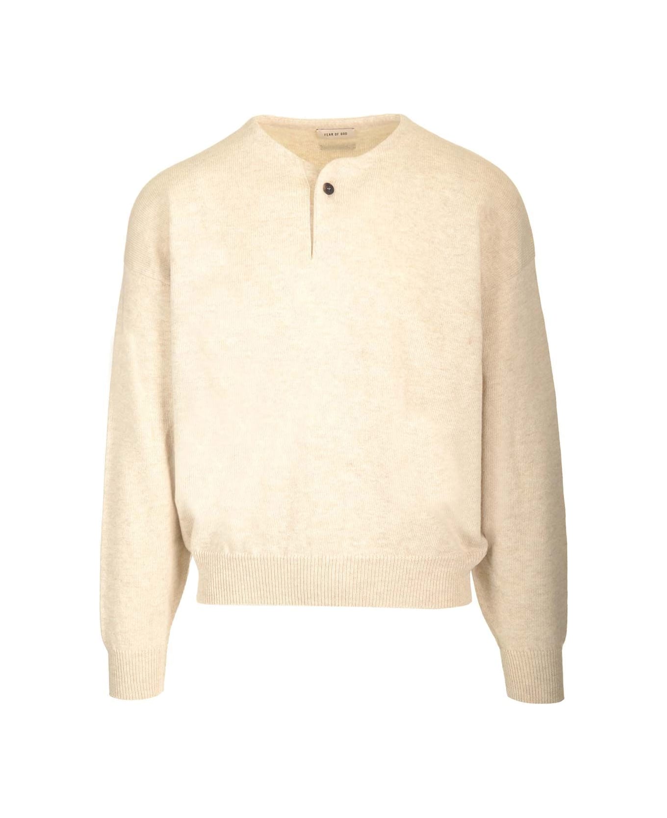 Beige extra fine merino wool henley by Fear Of God, with dropped shoulders, round neckline with button fastening. Logo label sewn on the back collar.