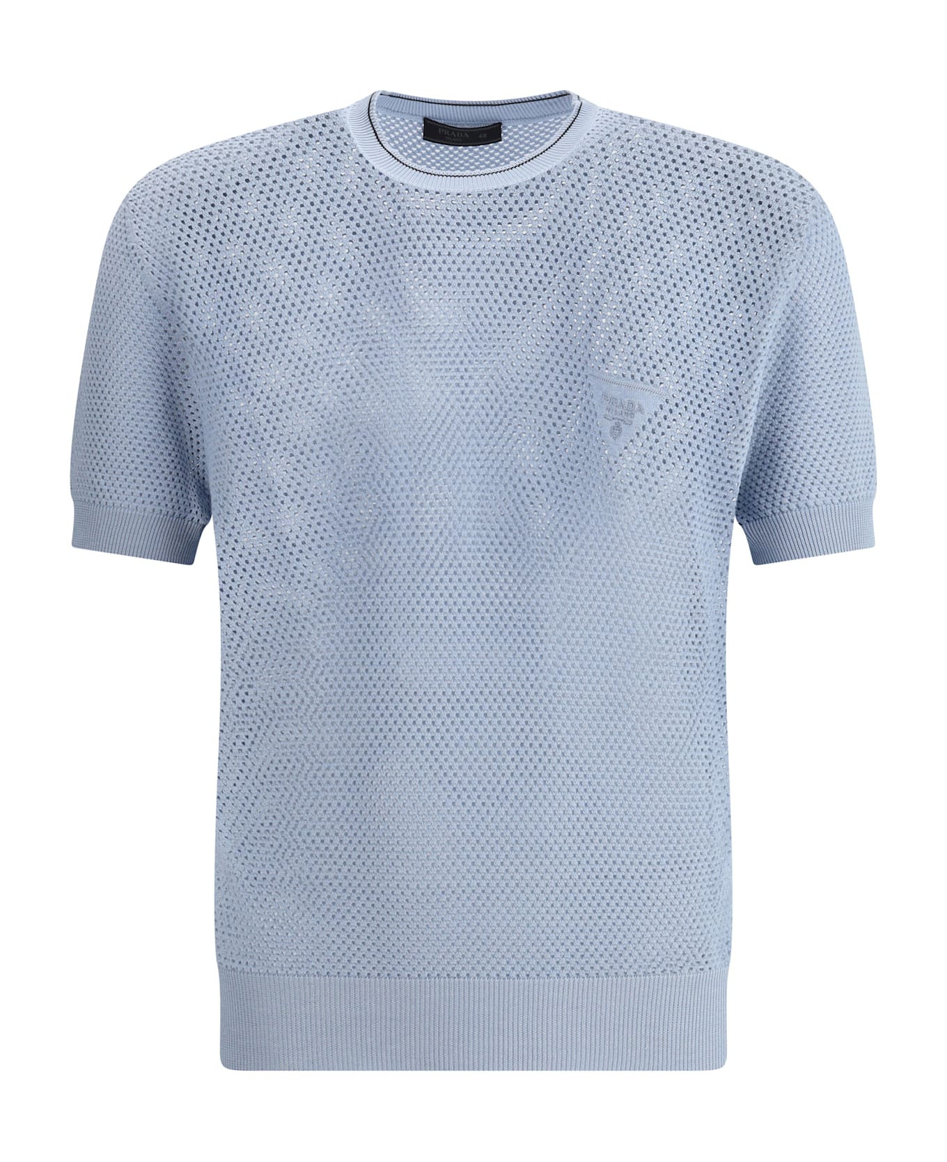 The prada silk t-shirt is an elegant and sophisticated piece. the ribbed crew neck offers a comfortable fit, while the all-over perforated design gives lightness and a unique visual effect. the iconic monogram embroidered on the front adds a distinctive and classy touch. the ribbed hem completes the look, making this t-shirt ideal for those looking for a refined yet versatile piece, perfect for any occasion. Composition: 62% % Silk, 38% % Cotton
