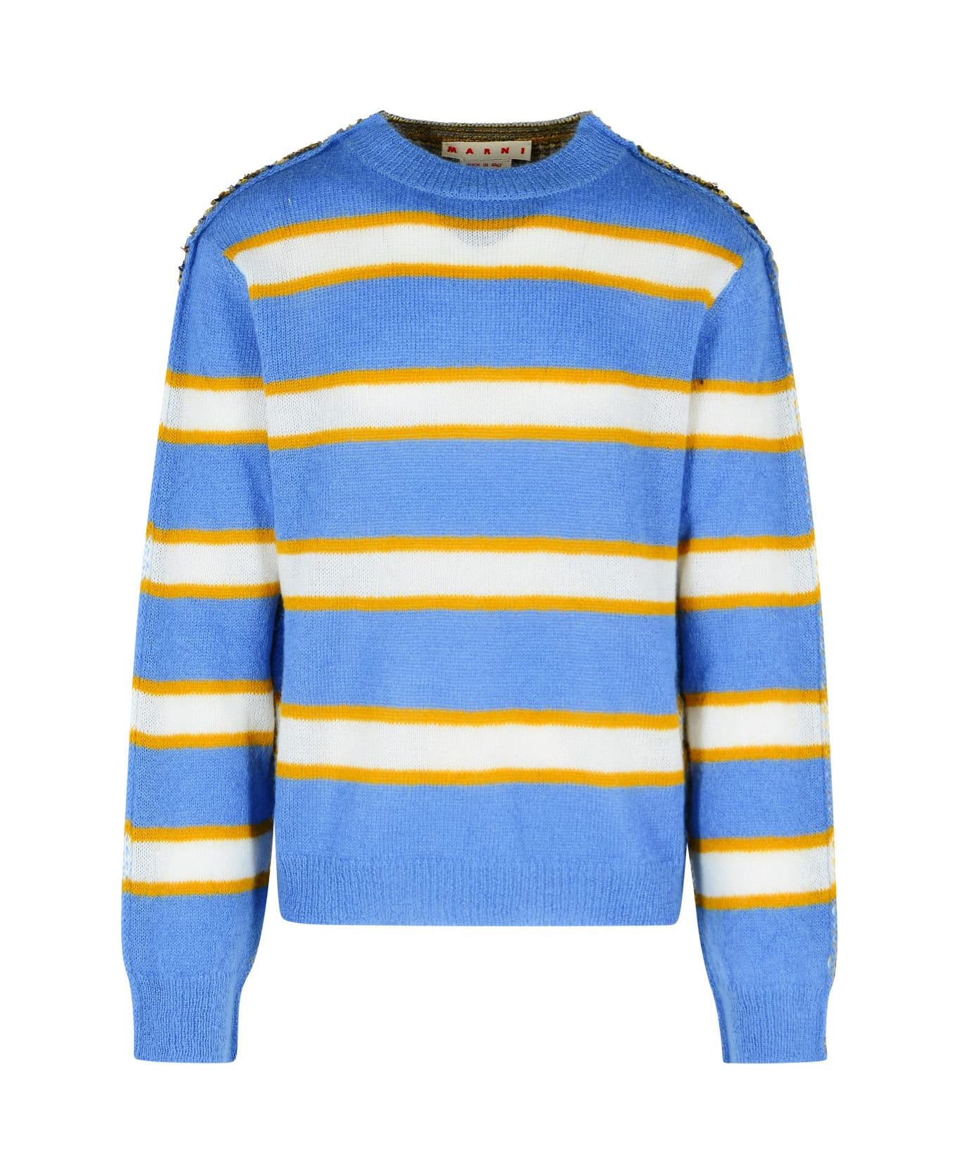 Ribbed round neckline, horizontal stripe pattern on the front, multicolor ribbed pattern at the back, straight ribbed hem, oversized fit Composition: 67% mohair, 28% nylon, 5% wool