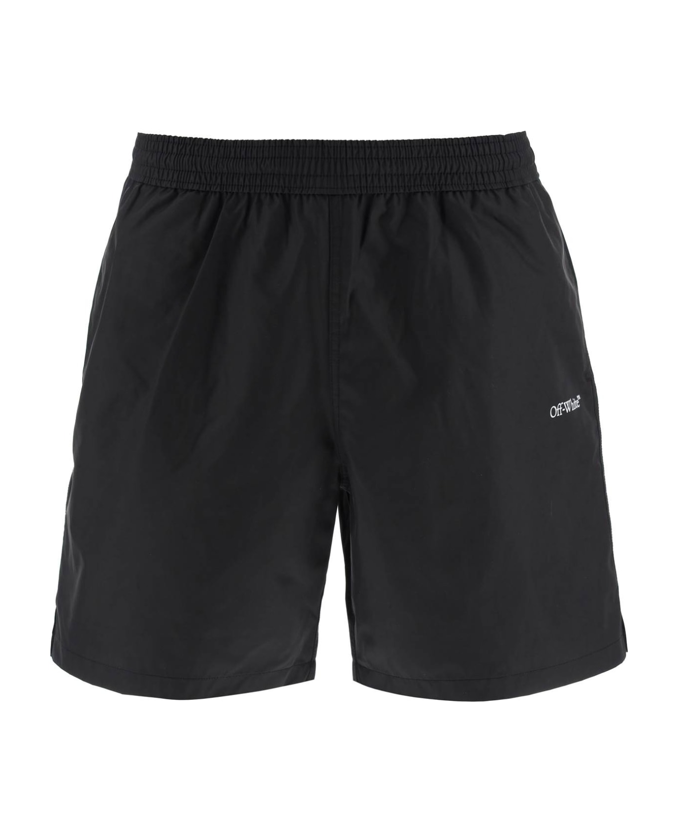 Off-White swim trunks made of technical fabric with iconic Arrow printed on the back pocket. Elasticized waistband with inner drawstring, side pockets and mesh inner brief. Composition: 100% PL