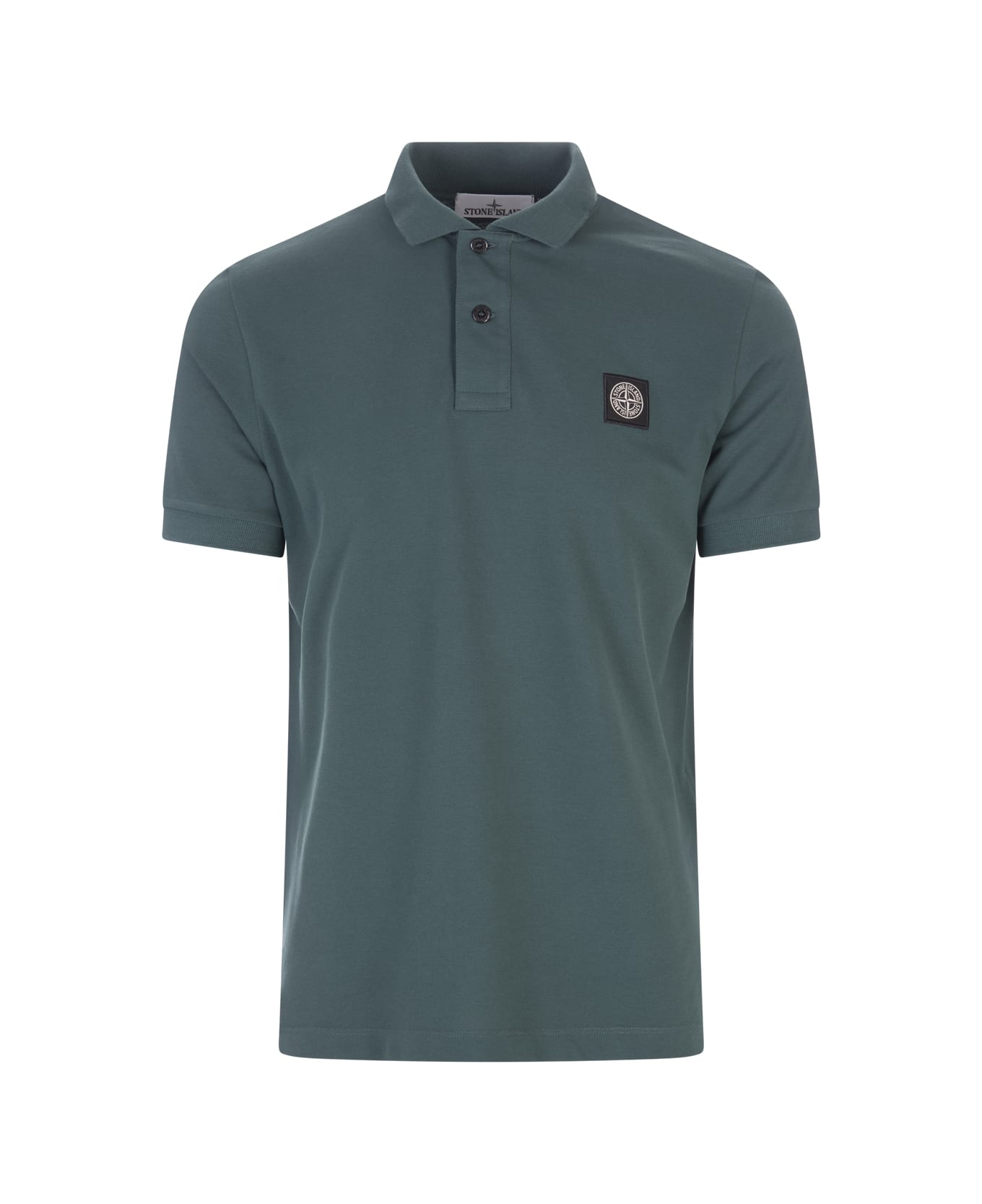 Short-sleeved slim fit polo shirt by Stone Island made of bottle green stretch cotton piqué. The garment features a ribbed collar, a two-button placket, and a Stone Island Compass Rose logo on the chest. Ribbed edging at the cuffs, with two parallel contrasting stripes. Side slits on the bottom with striped tape applied on the inside.
