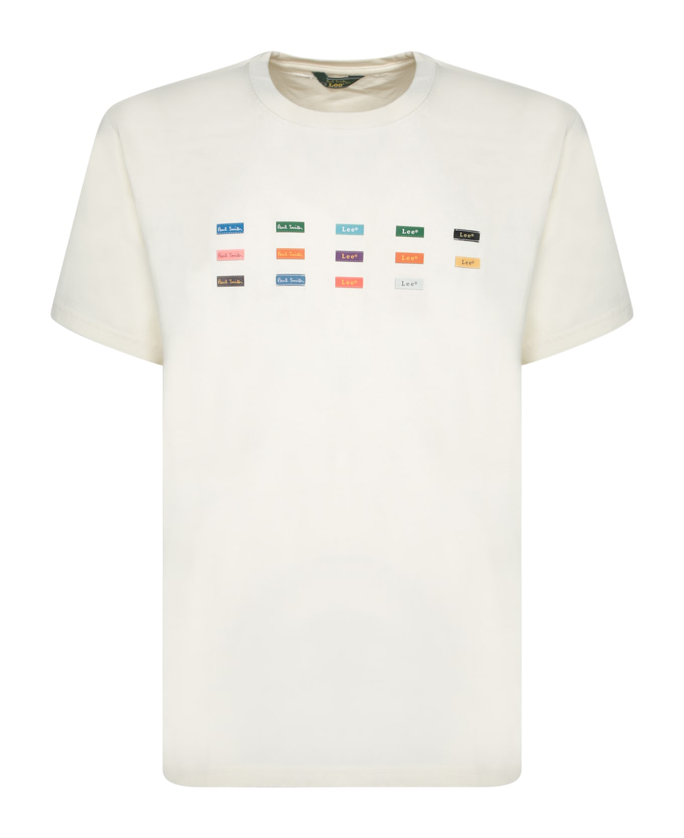 Exclusive Paul Smith white cotton T-shirt, featuring a series of colorful logos celebrating the collaboration with Lee. A perfect blend of casual style and unique detailing.