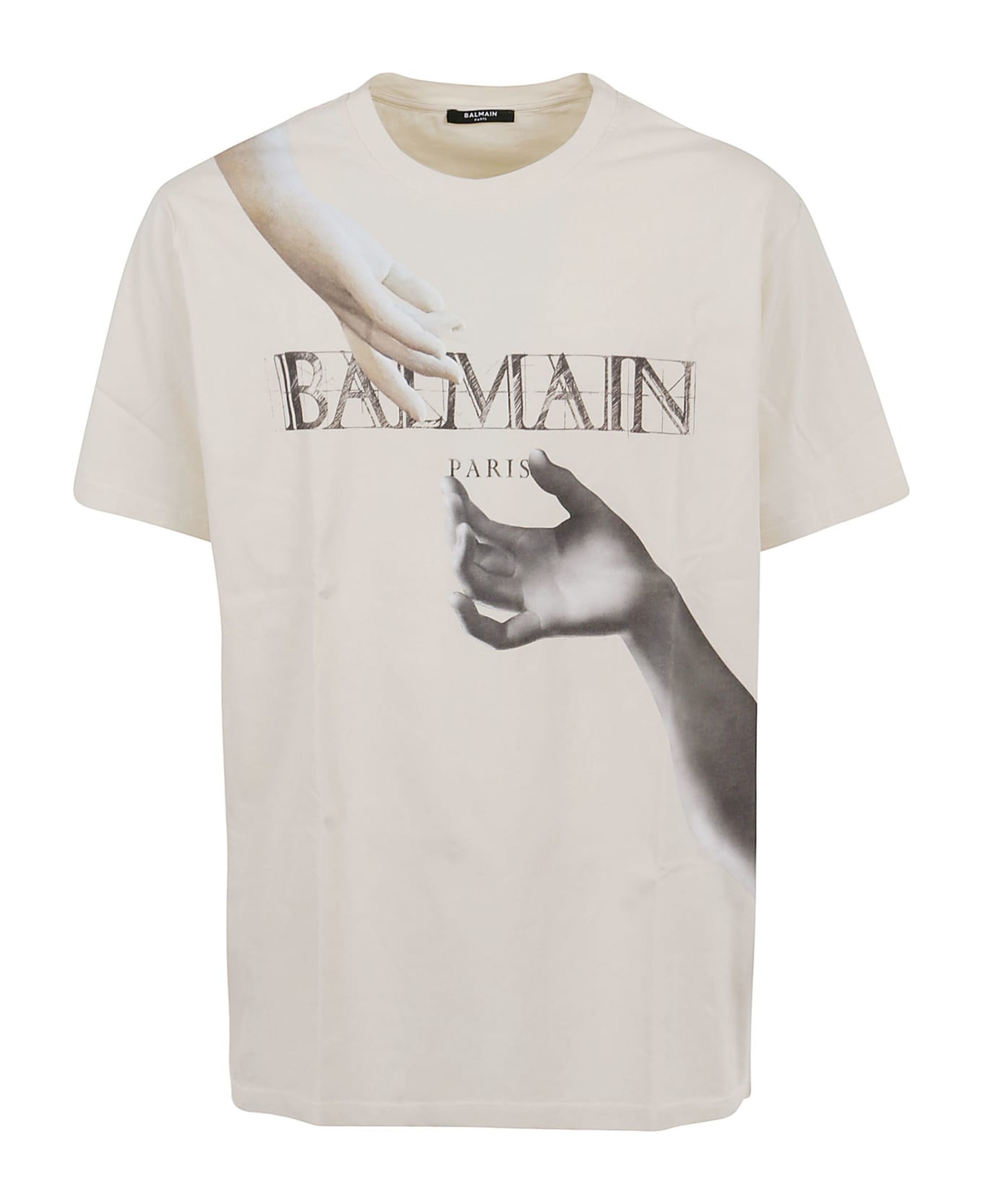Pure cotton T-shirt BY BALMAIN. Wide round neckline with ribbed knit; short sleeves. Oversized fit design. Statue print detail and printed Roman Balmain Paris logo.