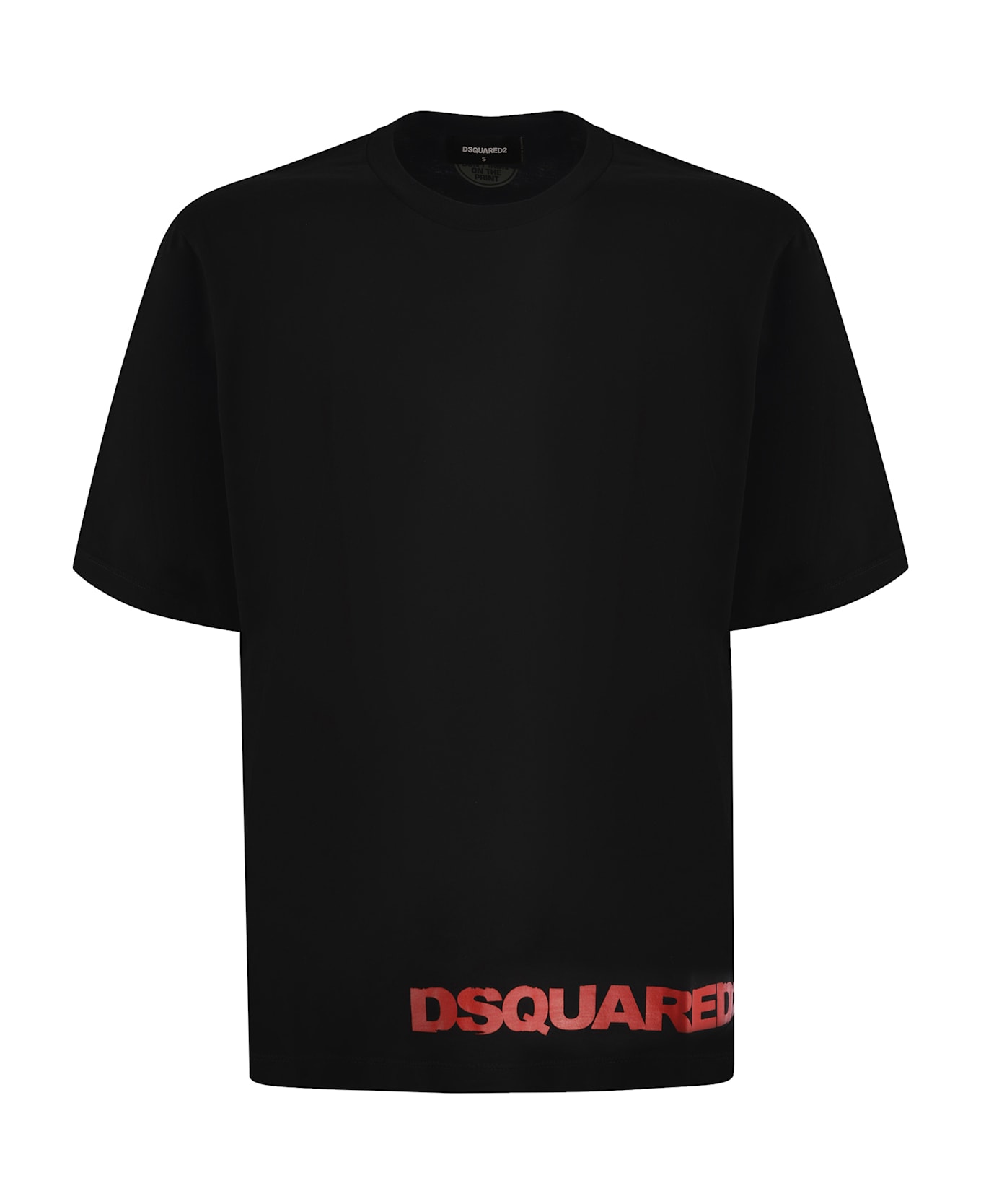 T-shirt Dsquared2 made of Black cotton. Ribbed crewneck. Short sleeves. Contrasting Red "Dsquared2" lettering logo on the bottom. Deliberate crease on the bottom. 100% Cotton