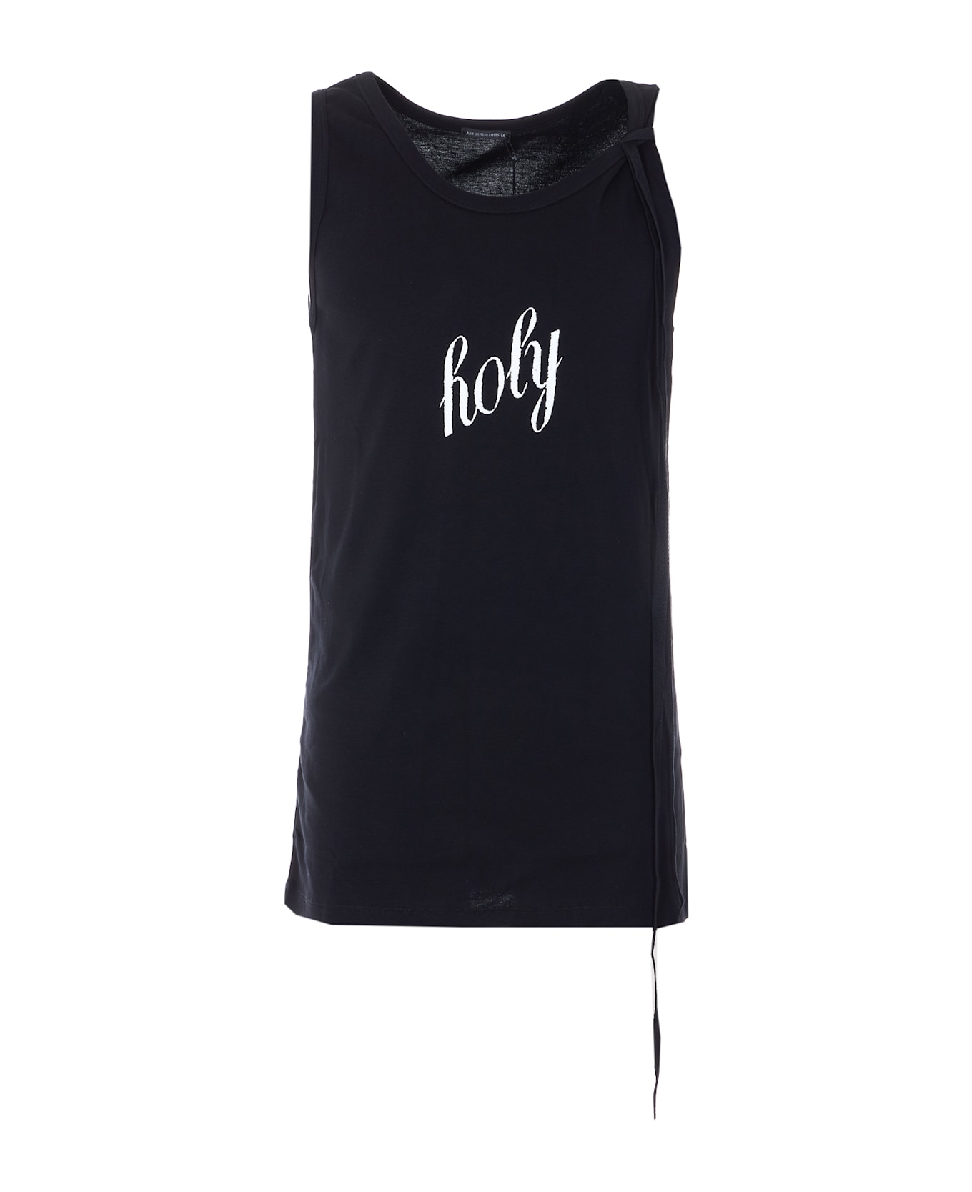 Ann Demulemester black tank top, Holy print on the front, crewneck, sleeveless, lace detail