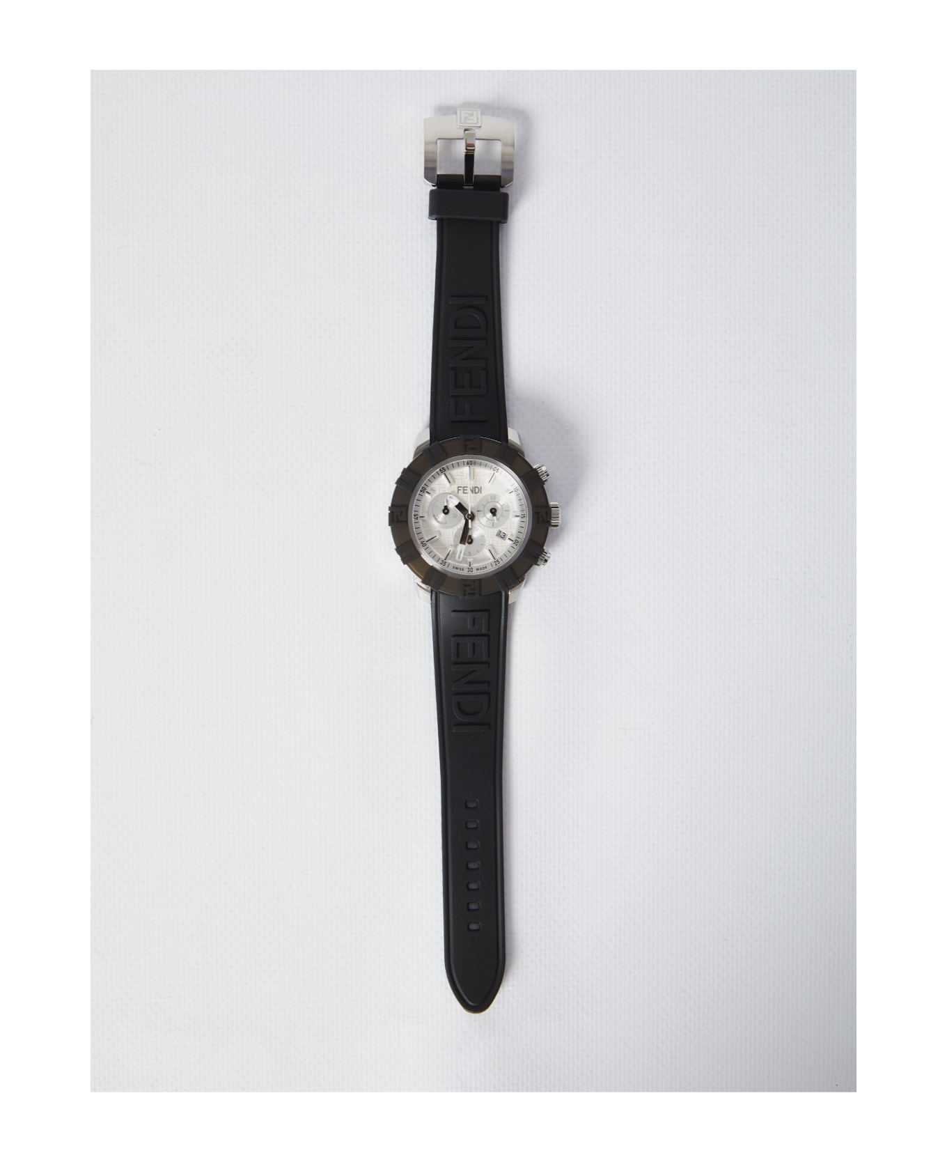 Fendastic watch with round 45mm case made of shiny and satin-finish black and silver stainless steel, with transparent silicon bezel. It features plated dial with FF print, three sub-dials, indices and details in black and silver hands. Band in grey FKM rubber, 22/18mm, with raised Fendi logo and silver-color stainless steel folding buckle.