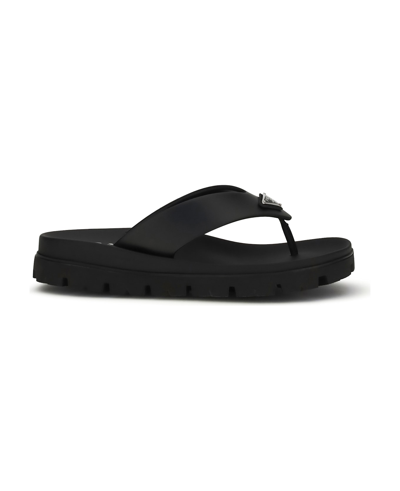 The leather flip-flop sandals by prada combine elegant minimalism with iconic details. made from smooth leather, they feature a rounded toe and the signature logoed metal triangle on the vamp, with an internal logo, perfect for completing refined summer looks. Composition: 100% % Calf Leather Bos Taurus