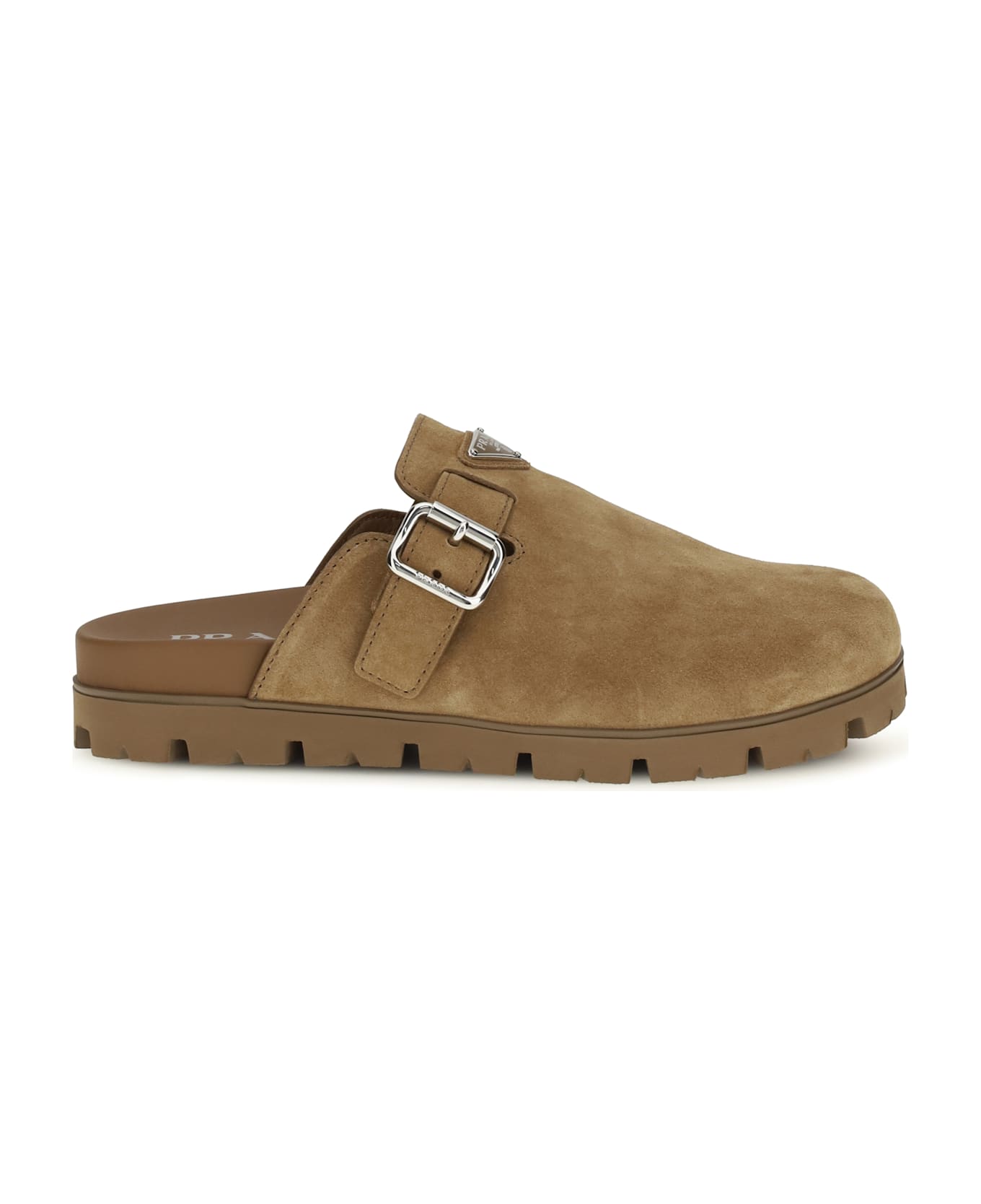 The suede mules by prada combine elegance and comfort in a minimalist and refined design. crafted from soft suede, they are embellished with the iconic metal triangle logo on the instep, which emphasizes their distinctive style. the round toe and adjustable strap ensure a comfortable and secure fit, while the logo printed on the inside adds a discreet touch of luxury. perfect for a casual yet sophisticated look. Composition: 100% % Calf Leather Bos Taurus