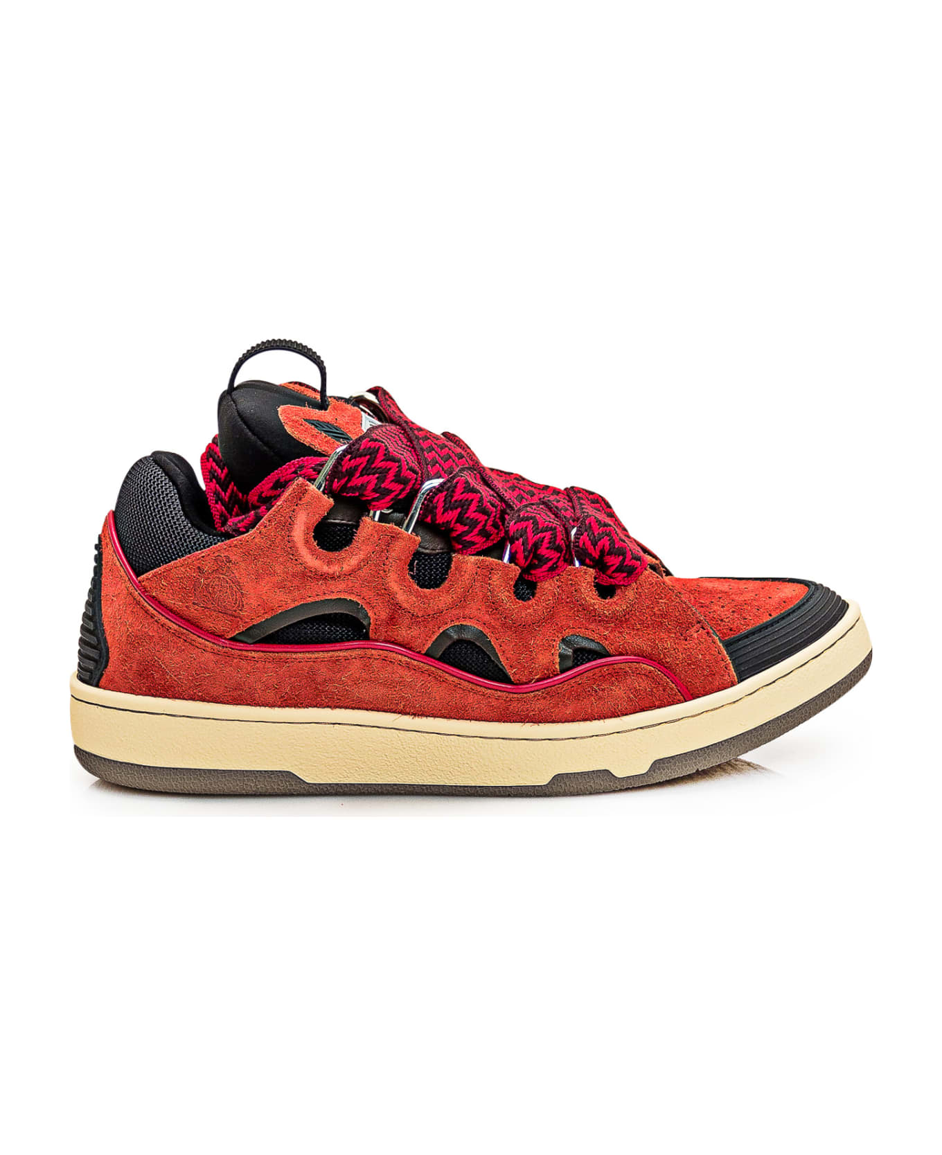 Red suede sneaker. Rubber inserts. Closure with laces with herringbone pattern. Logo on the tongue.