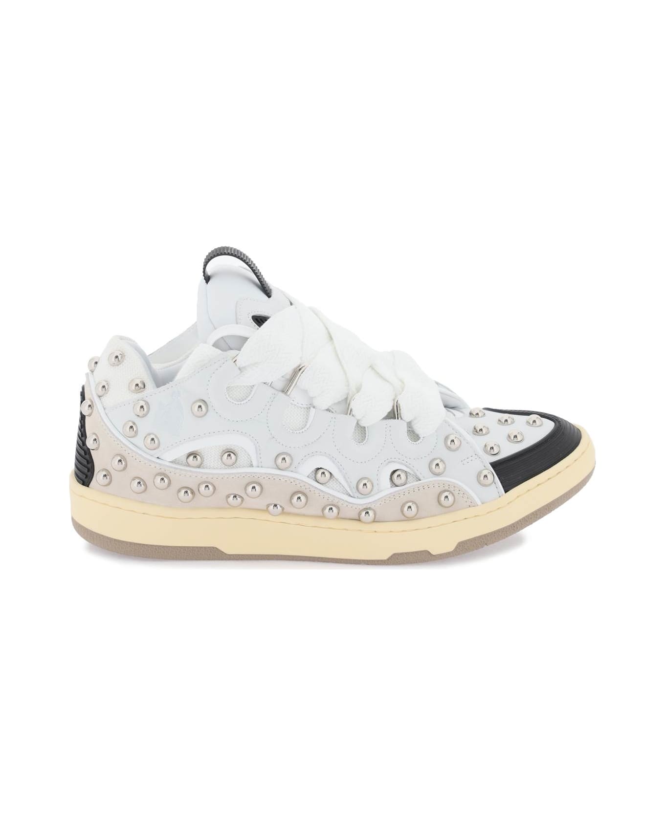 Lanvin Curb sneakers characterized by the voluminous shape and the multilayer structure in suede, nubuck leather and mesh embellished with all-over silver metal spheres. Padded tongue with logo plate, lace-up closure, rubber inserts on heel and toe. Upper laces with contrasting laminated jacquard and silver-finished metal eyelets. Fabric lining with removable insole, rubber sole.