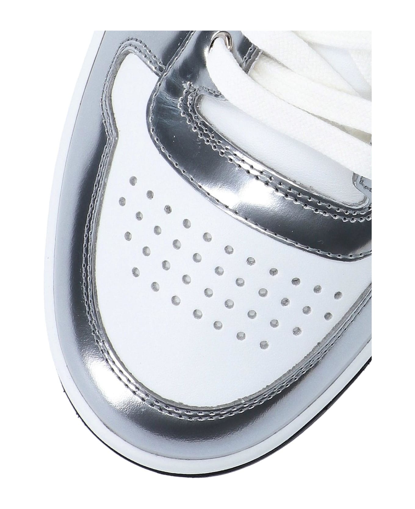 Prada 'Downtown' Sneakers, white leather, silver-toned details, round toe, perforated upper, lace-up closure, logo print on tongue, metal logo appliqué on side, back logo tab, rubber sole with embossed logo detailing on side.