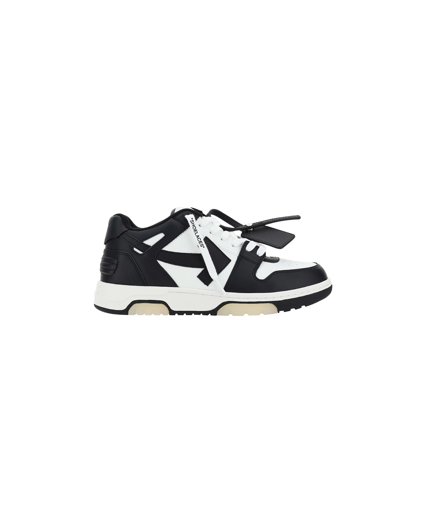 Out of office sneakers by off-white, iconic zipper tie tag on front, lace-up front closure, brand logo embossed on side panels, paneled design, iconic brand signature printed on front tab, perforated round toe.