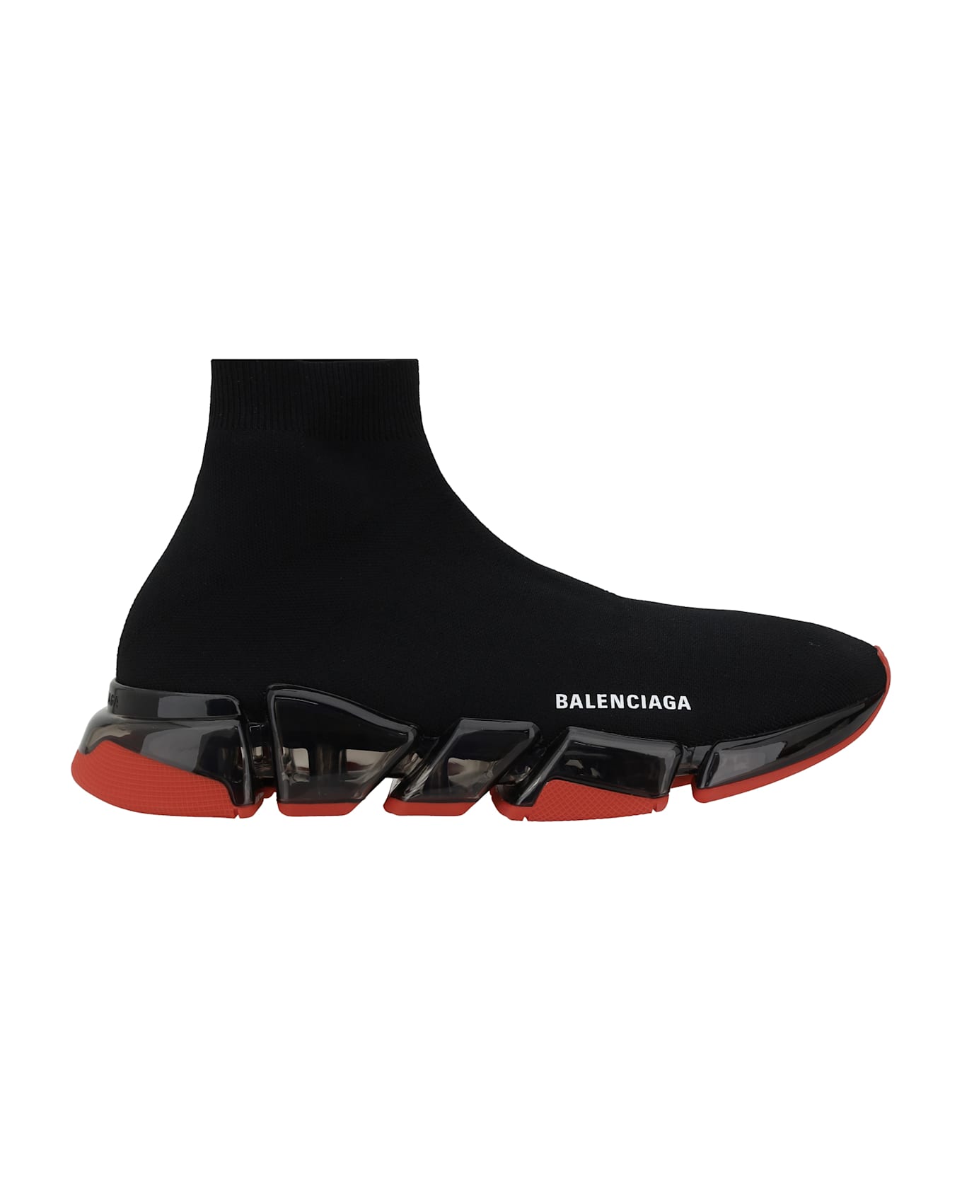 Balenciaga's speed sneakers are a bold and contemporary take on the sneaker concept, with an innovative design that combines comfort and style. the fitted sock style ensures a perfect fit and a lightweight feel, while the elongated toe on the front gives a sleek, modern look. the non-slip geometric textured sole offers added stability and comfort, while the brand's iconic contrasting signature on the outer side panel adds a distinctive and easily recognizable detail. the slip-on style without closures completes their practicality, making them easy to wear and perfect for casual-chic style.