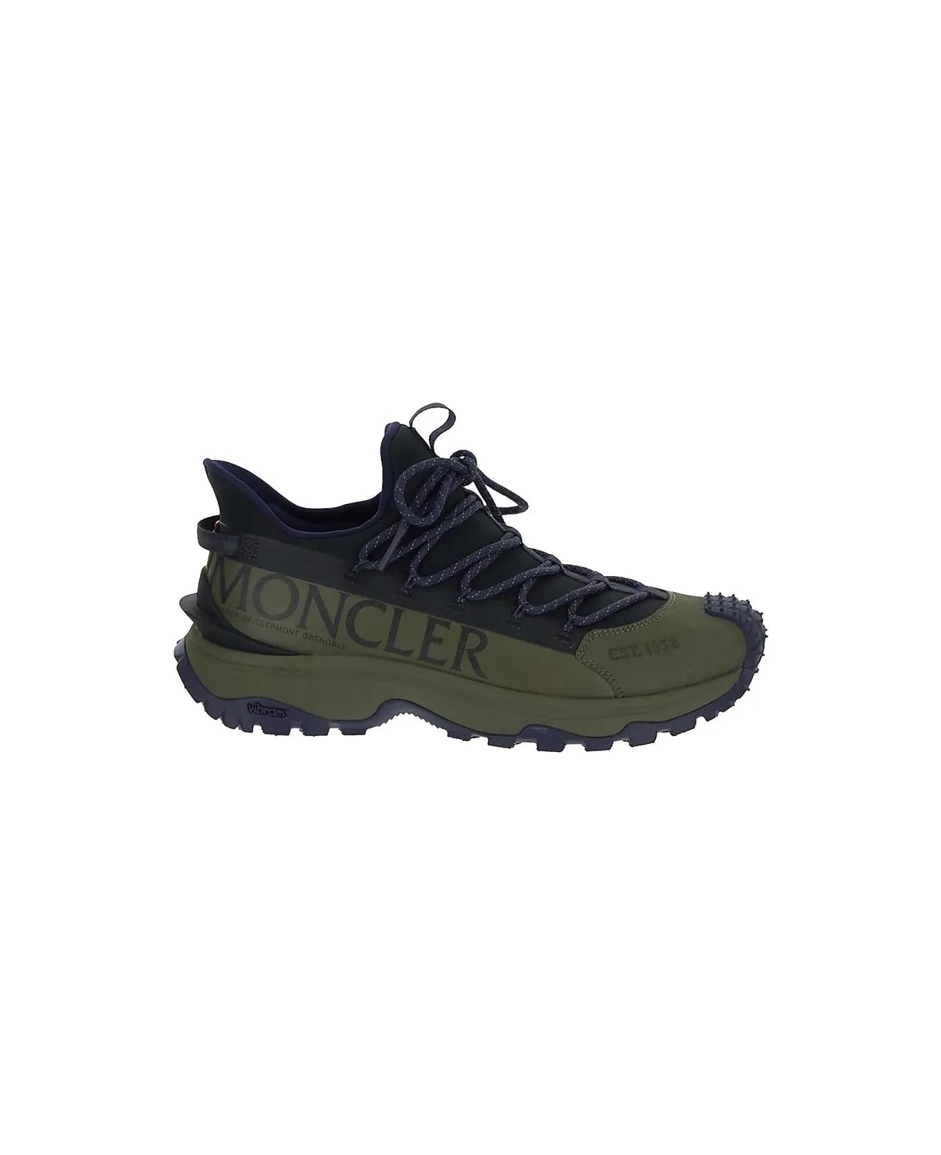 Moncler shoes in green and blue polyester with almond toe. The item is featured by rubber sole, lace-up closure and side logo print.