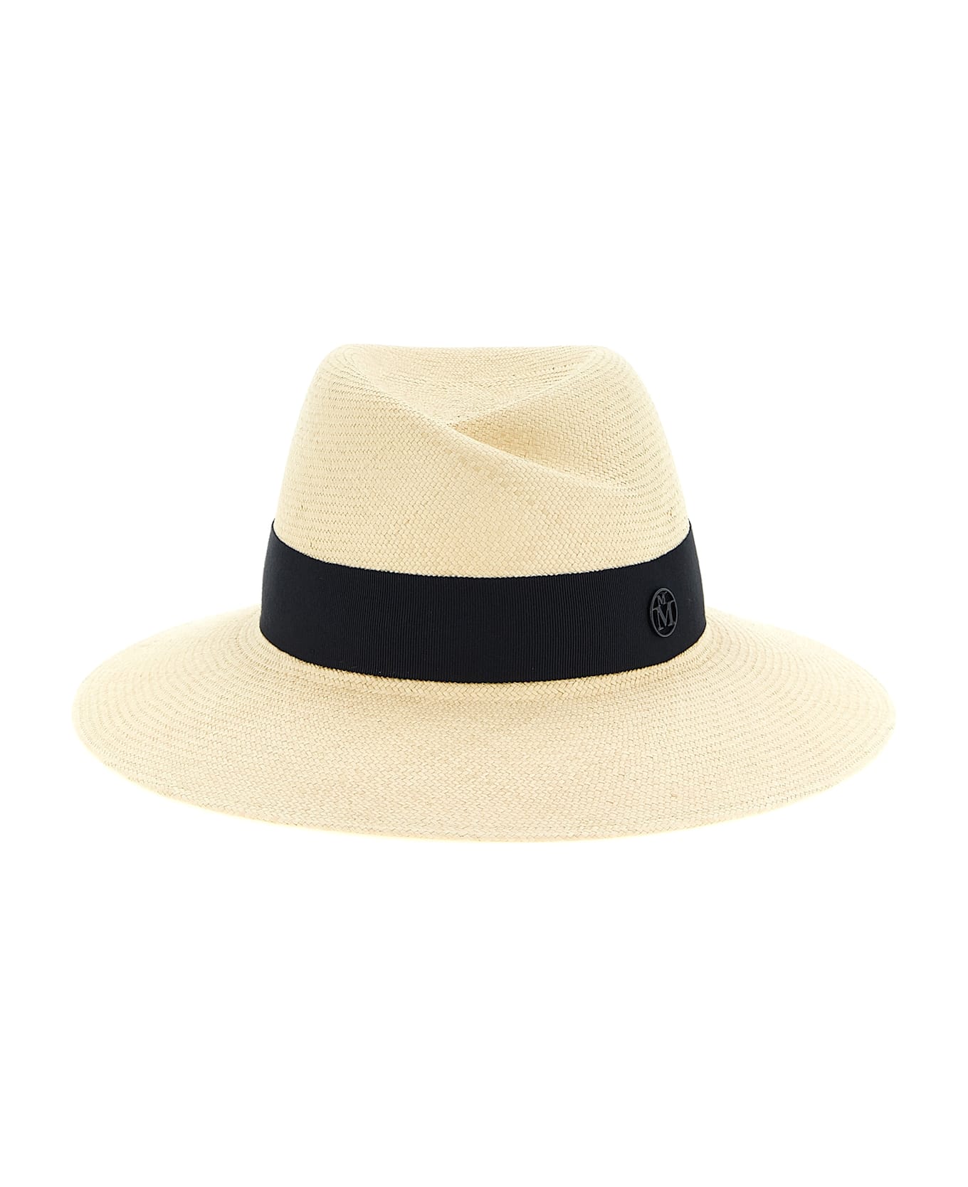 Virginie' straw hat, fedora model with grosgrain ribbon and tone-on-tone metal logo, wavy fold detail on the front cap. 'The Iconics' collection.