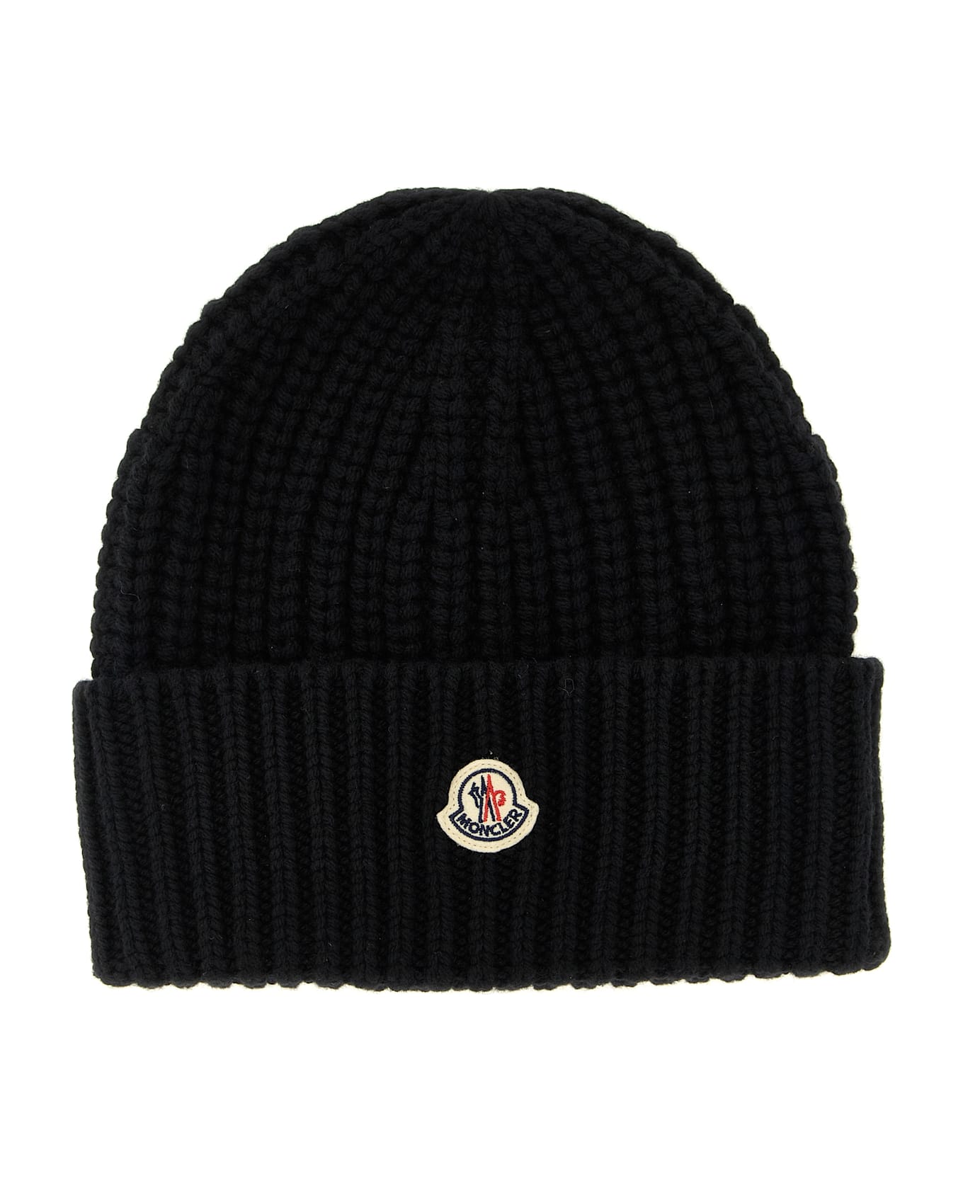 Knitted wool and cashmere blend beanie with front felt logo patch.