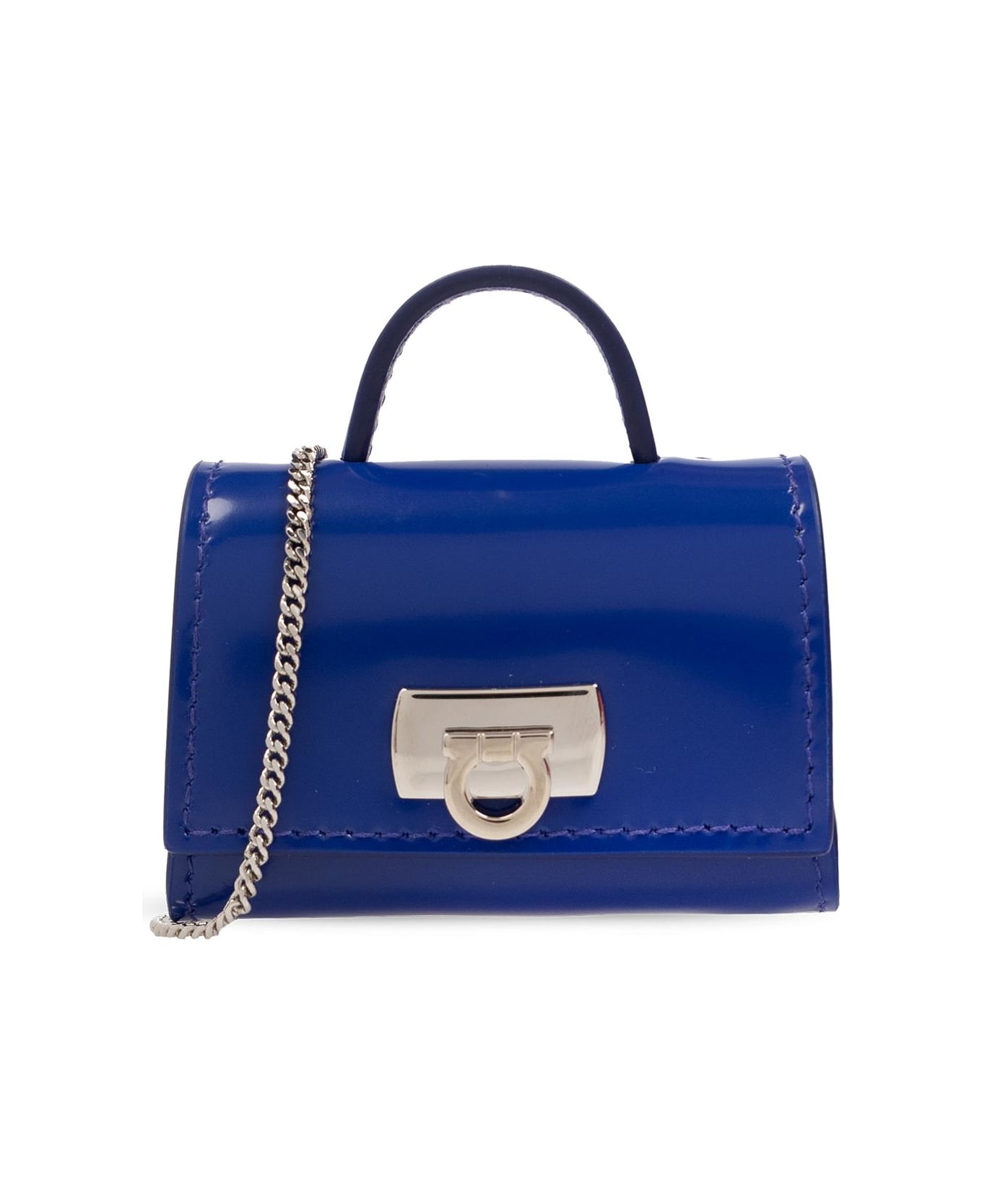 Blue AirPods case from FERRAGAMO. Made of patent calf leather, this item fastens with a snap and features silver-tone metal hardware, including a logo plaque on the front. Composition: Calf Leather Metal