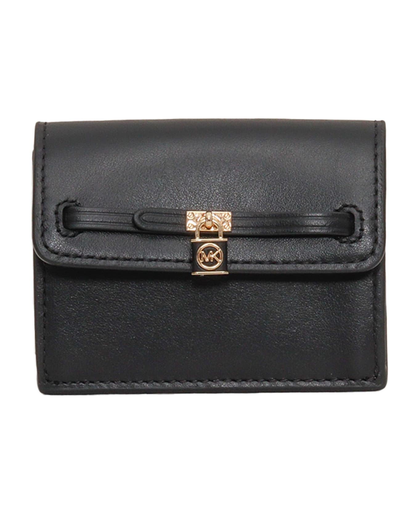 Leather card holder, press stud fastening, two card holder slots on the back, gold-finish metal padlock 10,5 x 8 cm