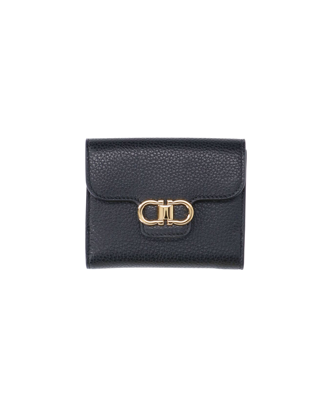 Ferragamo Gancini wallet in black calf leather, front flap closure, gold metal gancini logo on the front, card slot, inner bill compartment, embossed logo inside. Composition: 100% Calf Leather